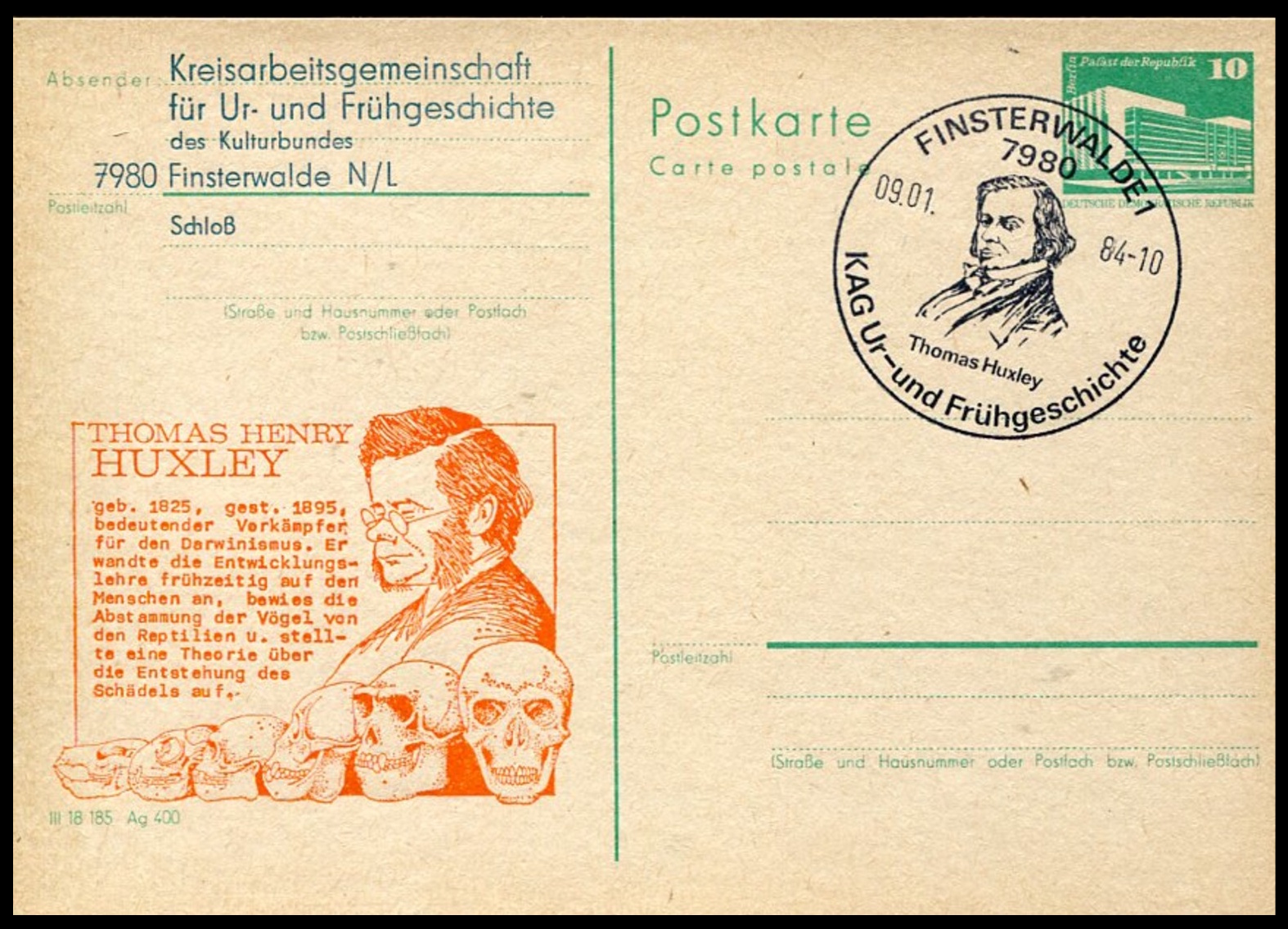 | Thomas Huxley on commemorative postmark and cachet of the postal stationery of German Democratic Republic, 1984 |