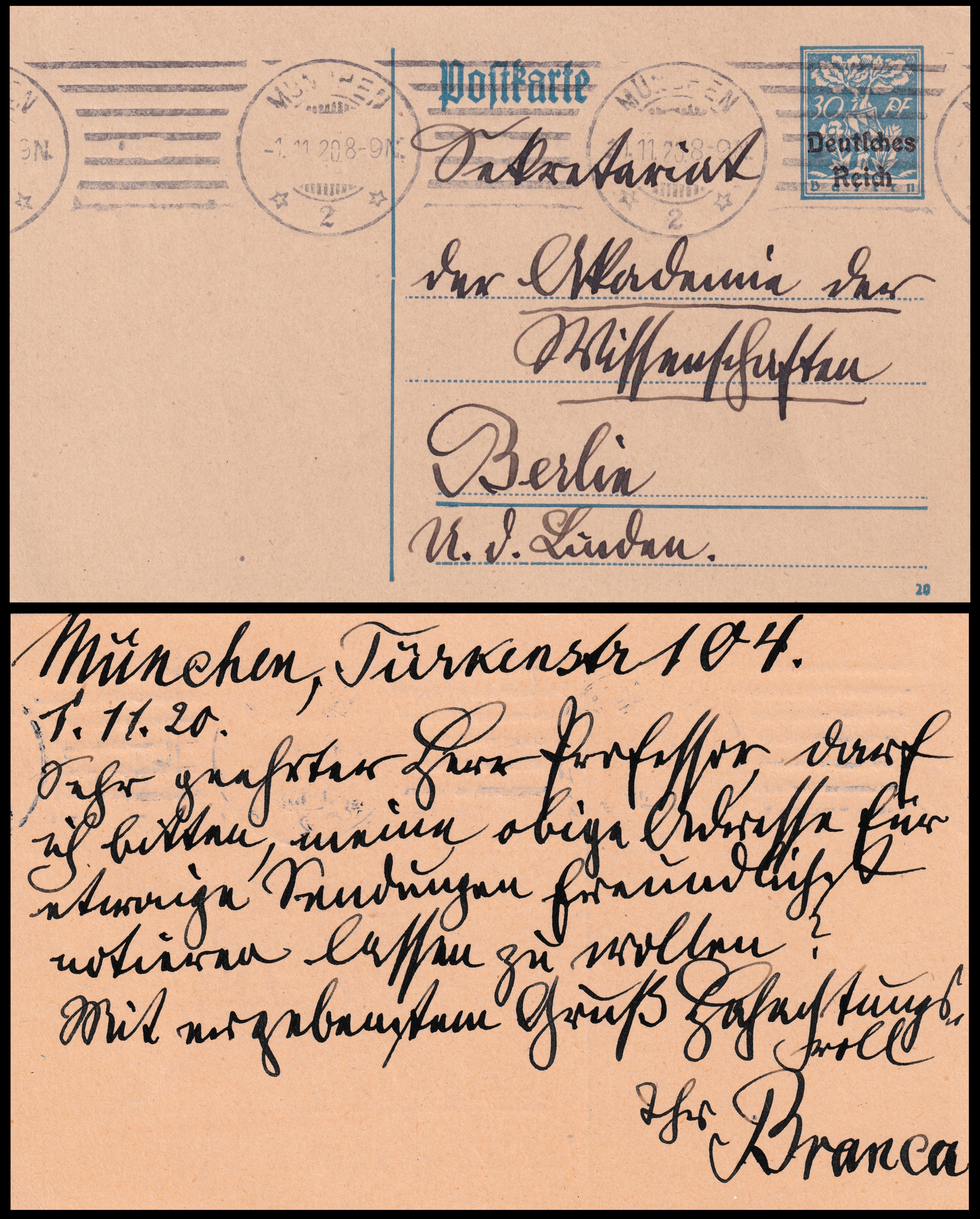 Postcard sent by Wilhelm von Branca in 1920 to the Natural History Museum in Berlin |