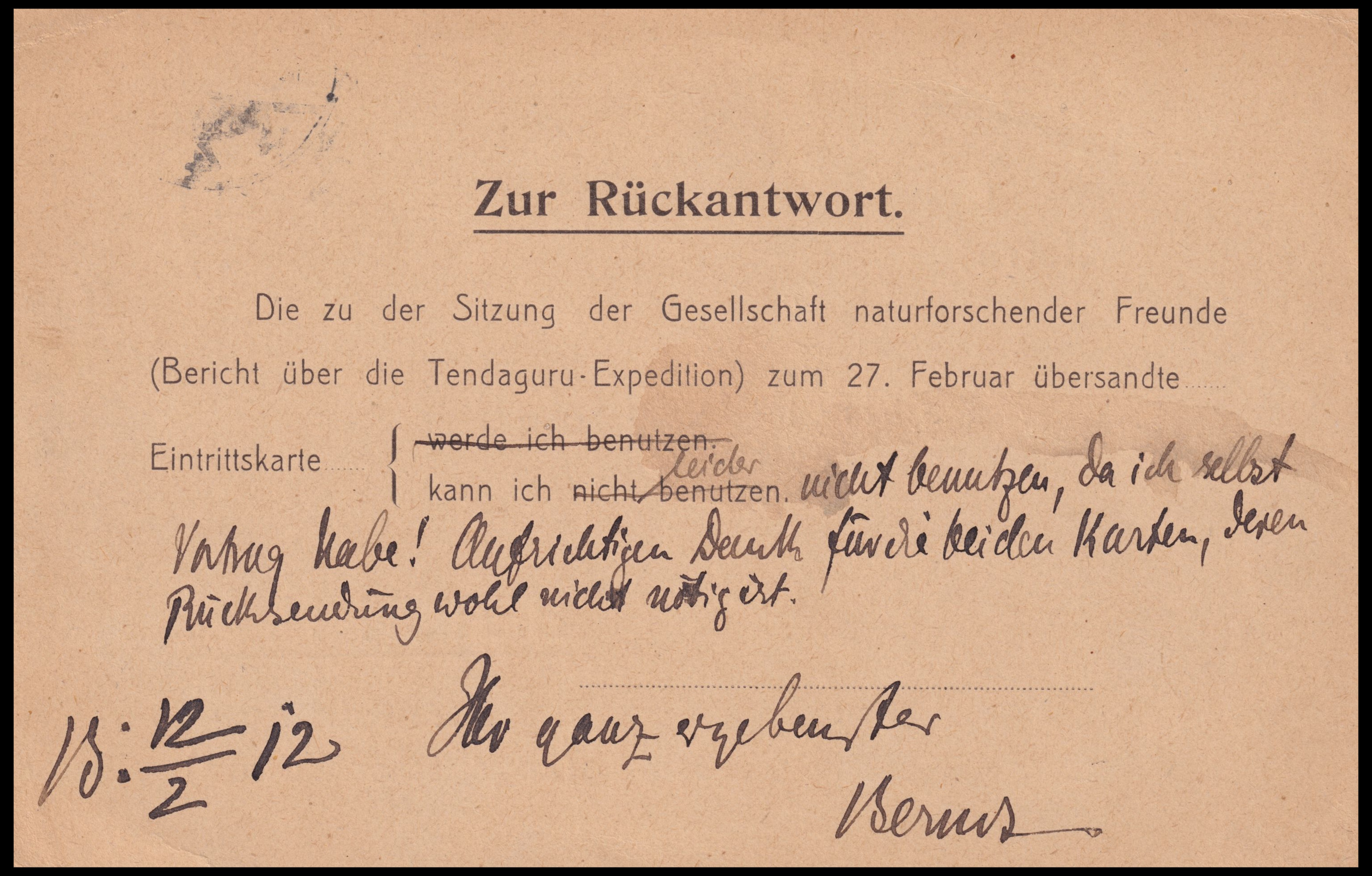 | Translation to English. [Printed part] The admission ticket sent for the meeting of the Society of Friends of Natural Science on February 27 (Report on the Tendaguru Expedition) can I ... [Handwritten Part] unfortunately not use, as I have a lecture myself! Sincere thanks for the two tickets, whose return is probably not necessary. 15/2 12 Yours very sincerely [signature] |