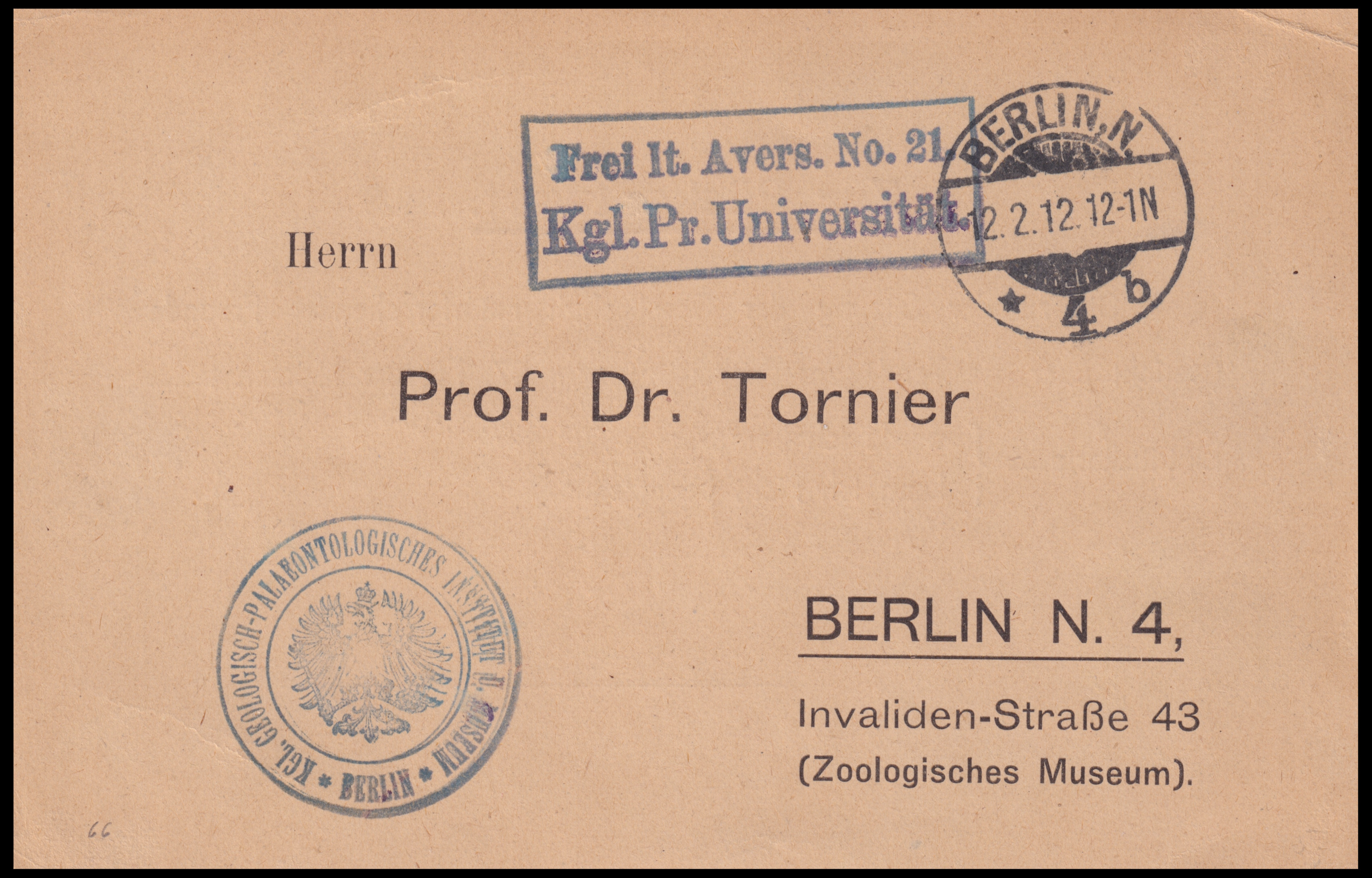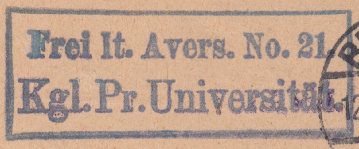 Frei lt. Avers. No. 21 / Kgl. Pr. Universitätindicates postal fee exemption (“Frei lt. Avers”) granted to the Royal Prussian University (Königlich Preußische Universität) — meaning it was official university correspondence.