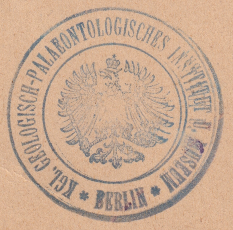 Geologisch-Paläontologisches Institut u. Museum d. Kgl. Universität Berlinwith the Prussian eagle emblem in the middle, can be translated as