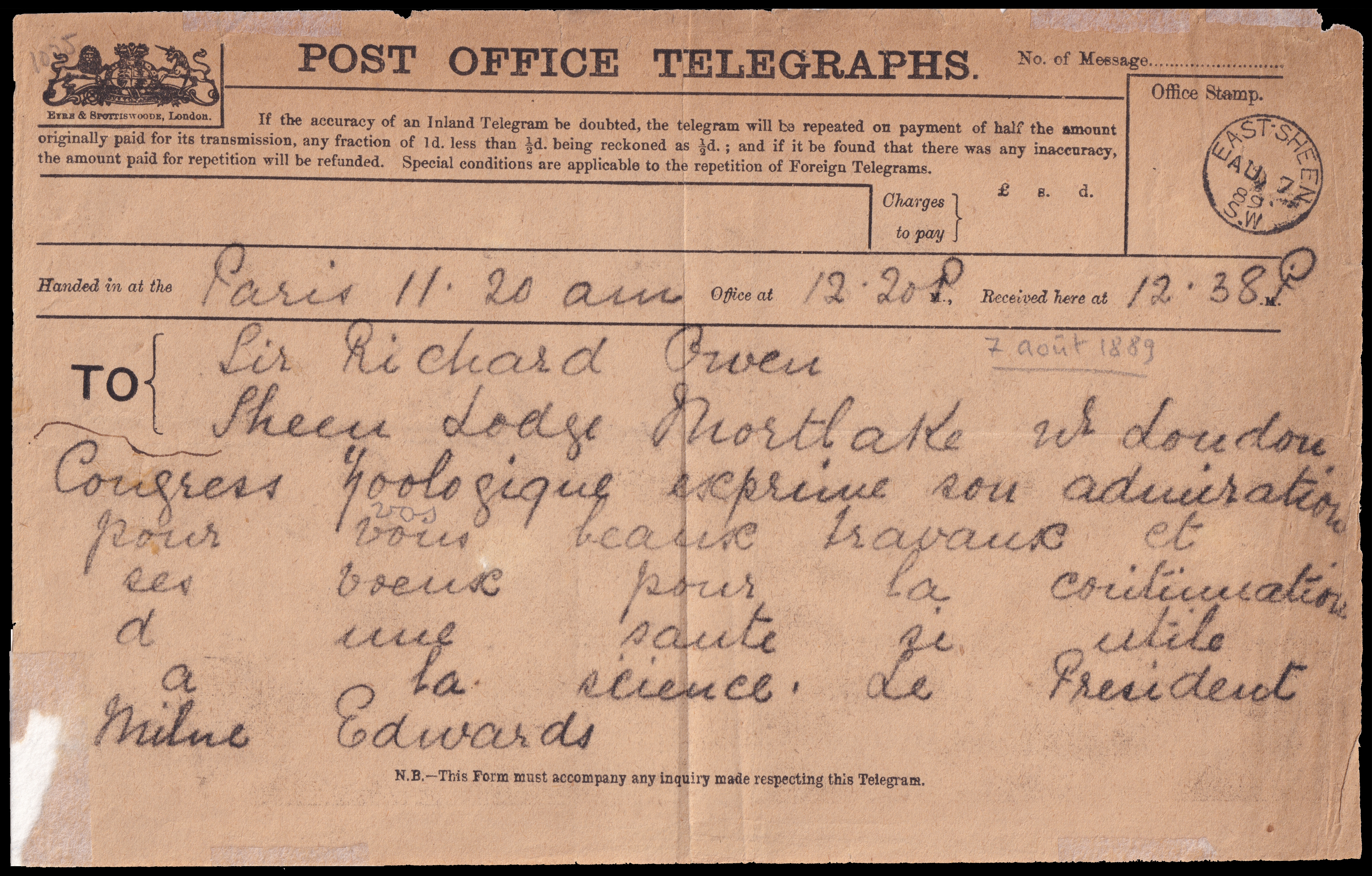 Received here at 12.38pm TO: Sir Richard Owen Sheen Lodge Mortlake w[est] London |