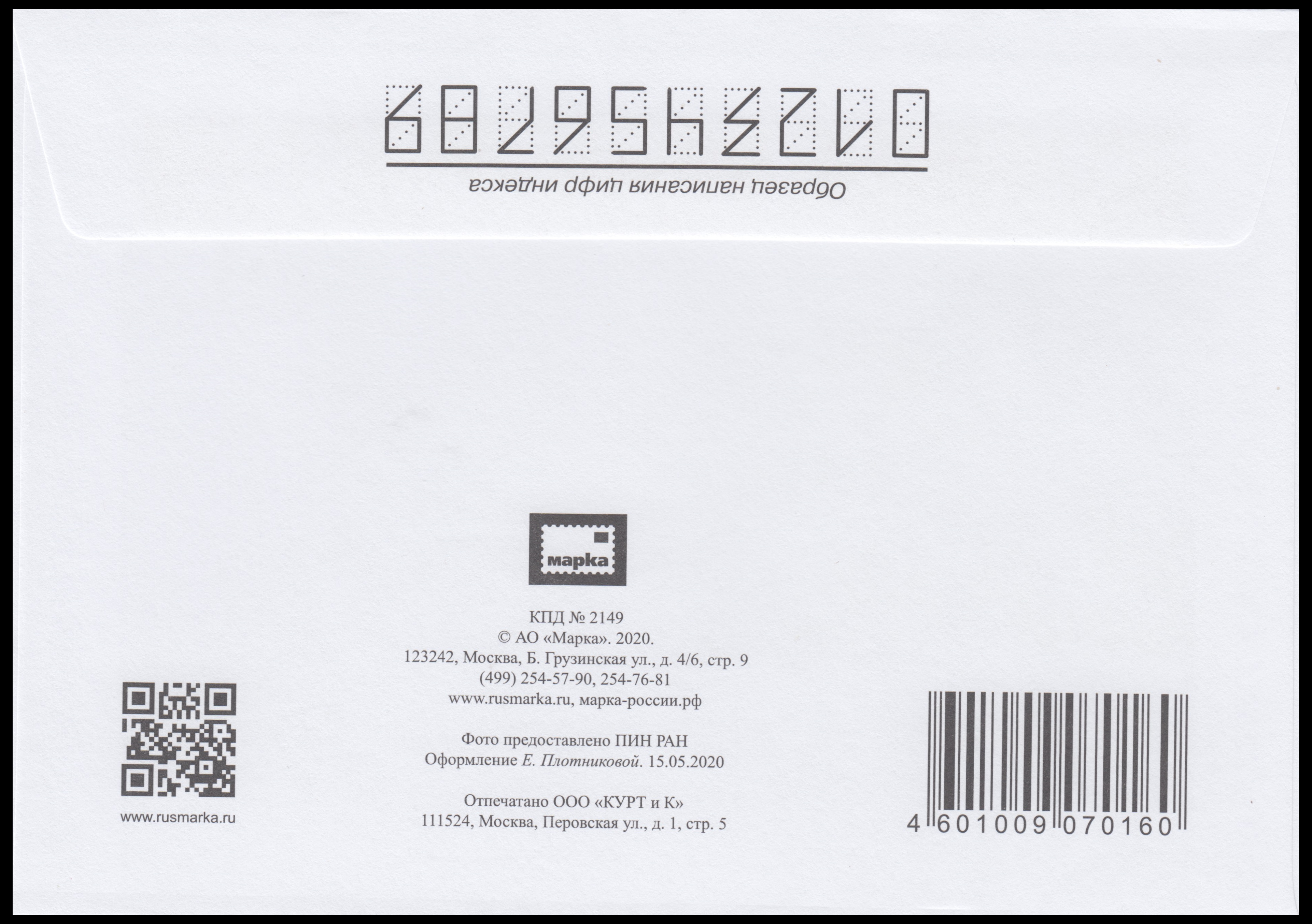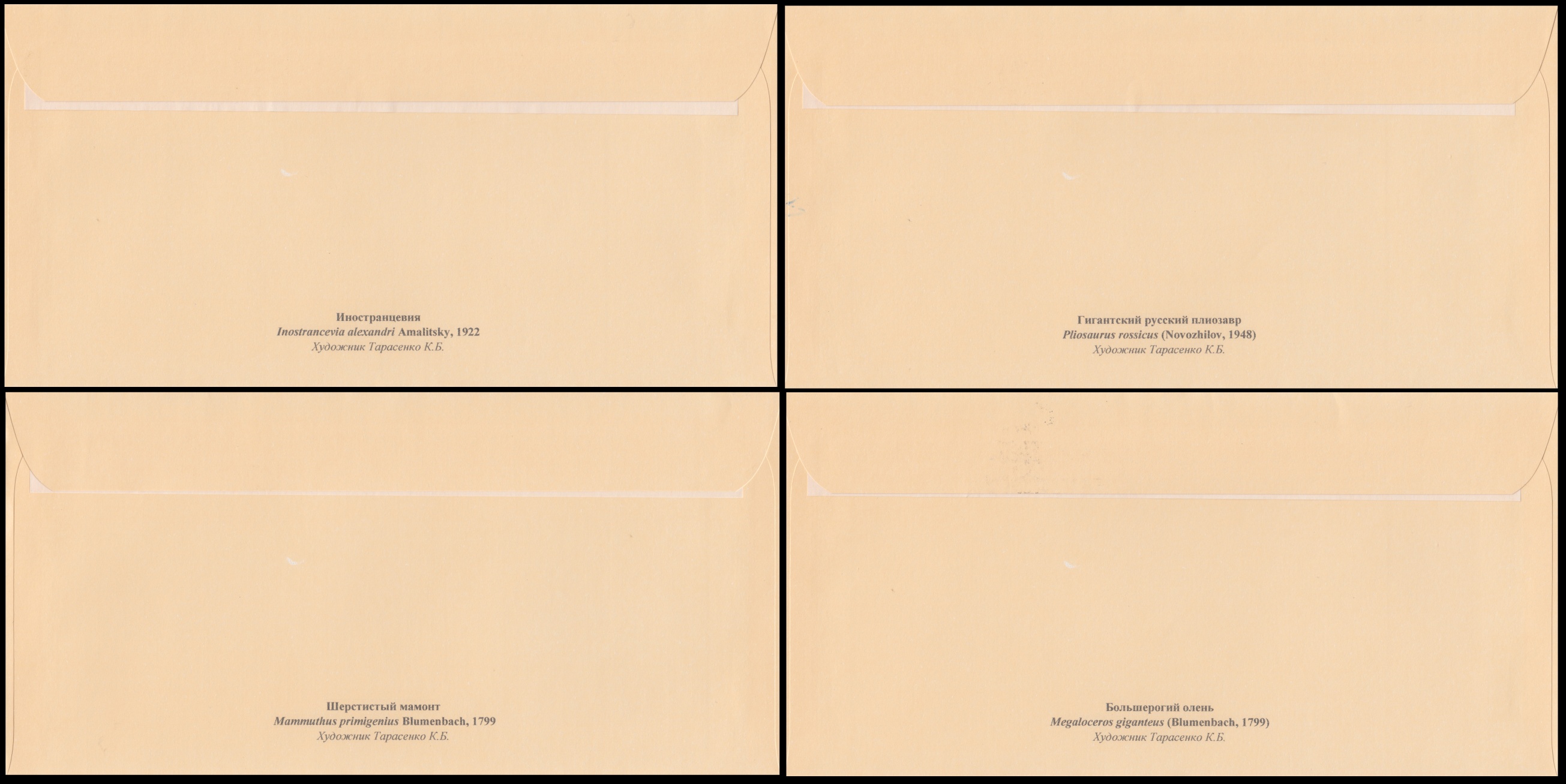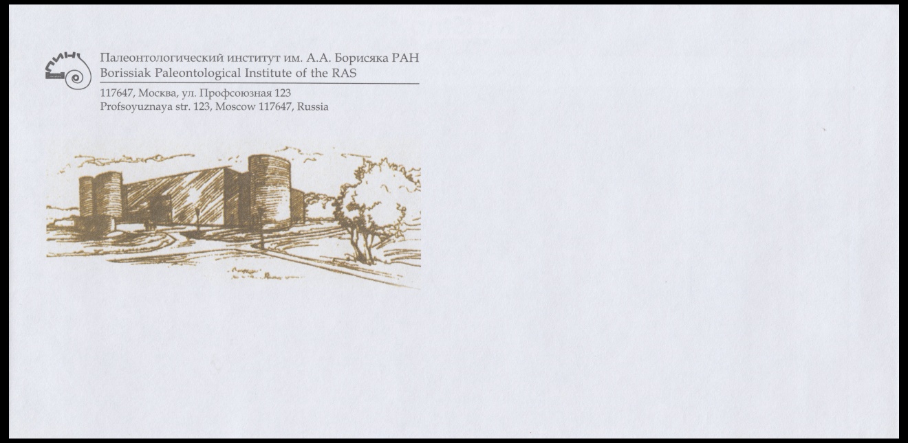 FDC based on official cover of Paleontologic Museum in Moscow. The cachet shows the building of the museum. | Hand made covers, the cachet is manually painted in monochrome watercolor. The reverse side has a brief text in the bottom. | Commemorative postcards with Moscow postmark |