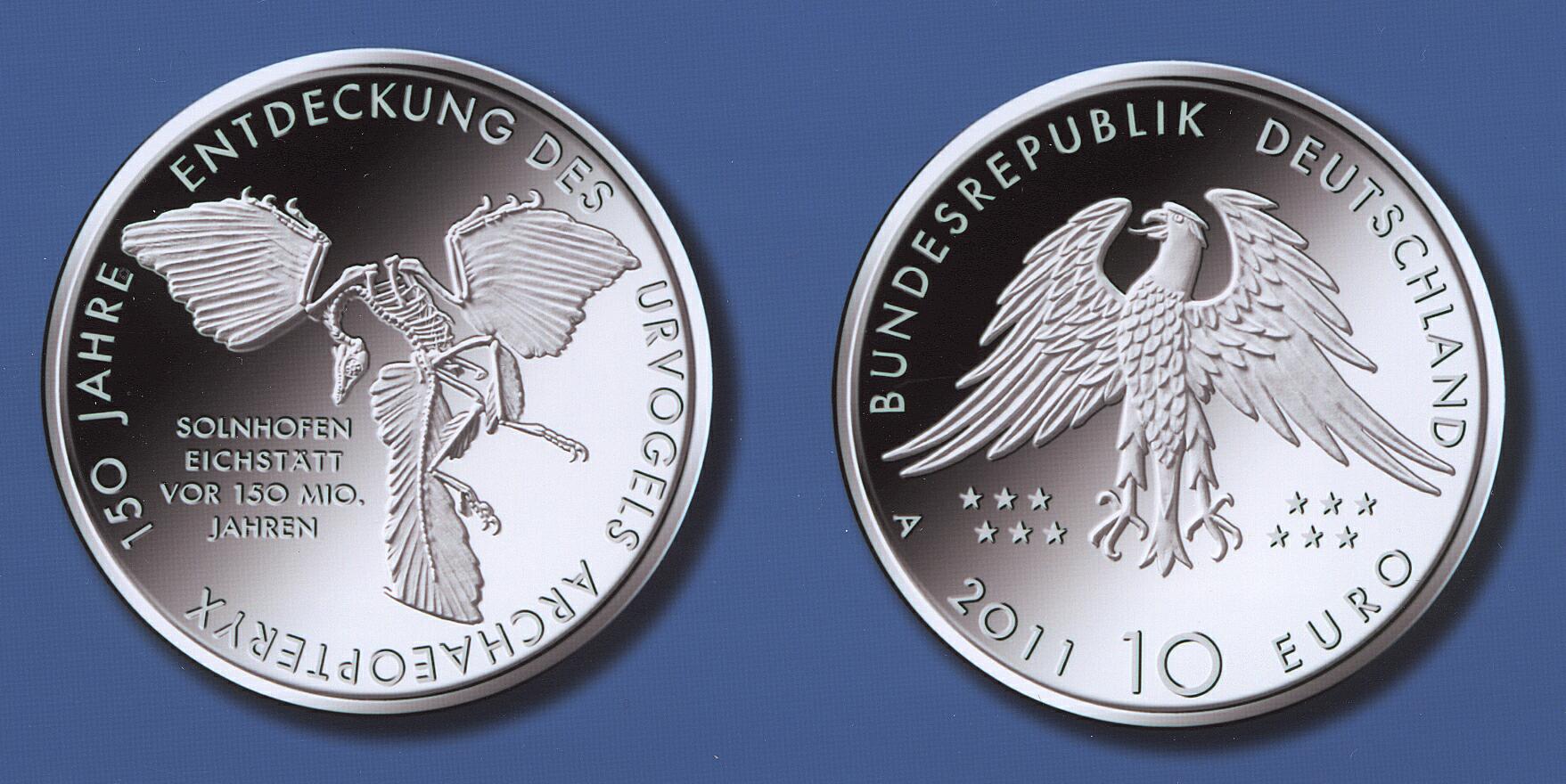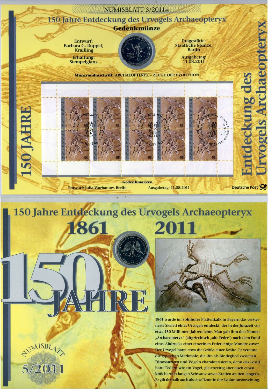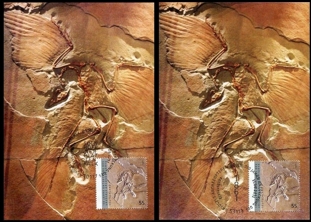 On August 11, 2011 Deutsche Post issued a single stamp to commemorate 150 years of discovery of Archaeopteryx (printed in Mini-Sheet of 10 stamps). The best fossil exemplar, mostly known and appear on many pictures and illustartions of Paleontology related books, called "Berlin speciment" - depicted on the stamp, and stored at "Berliner Museum fuer Naturkunde".