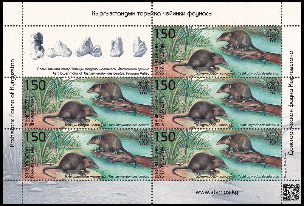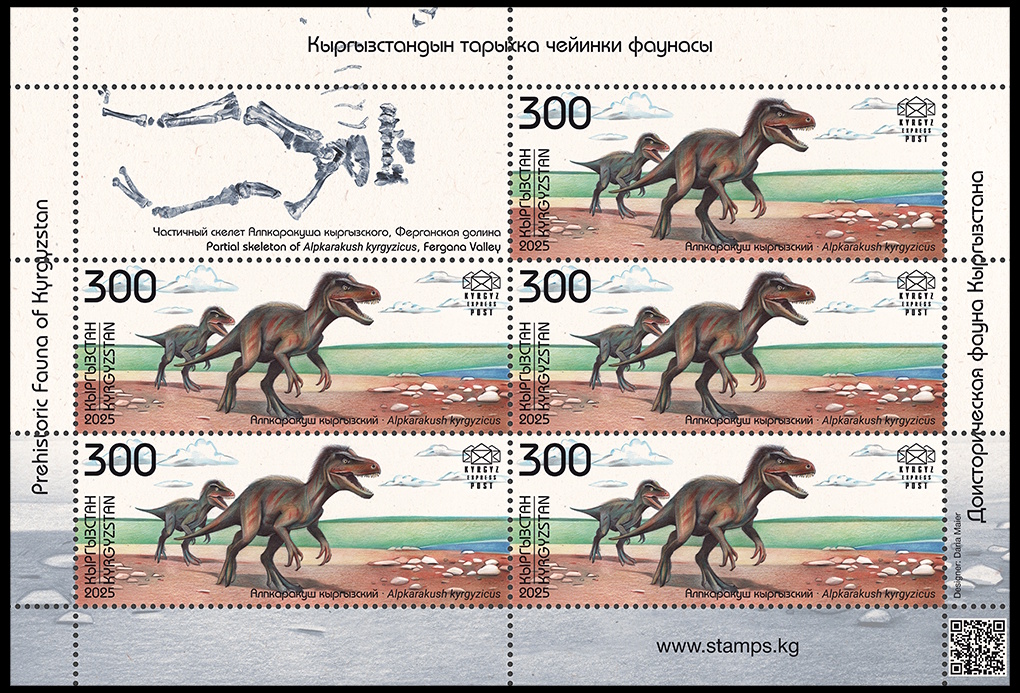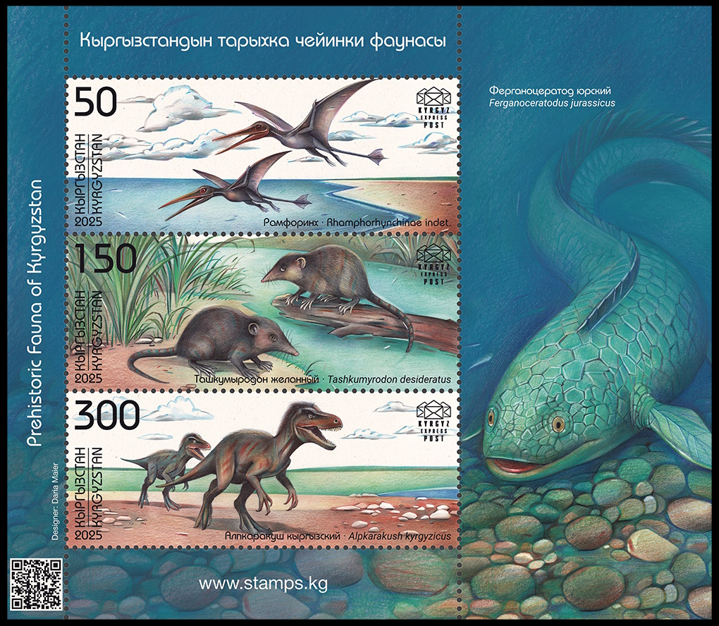 The stamps come in Mini-Sheets of five, each with a label showing fossils of prehistoric animals discovered in Kyrgyzstan.