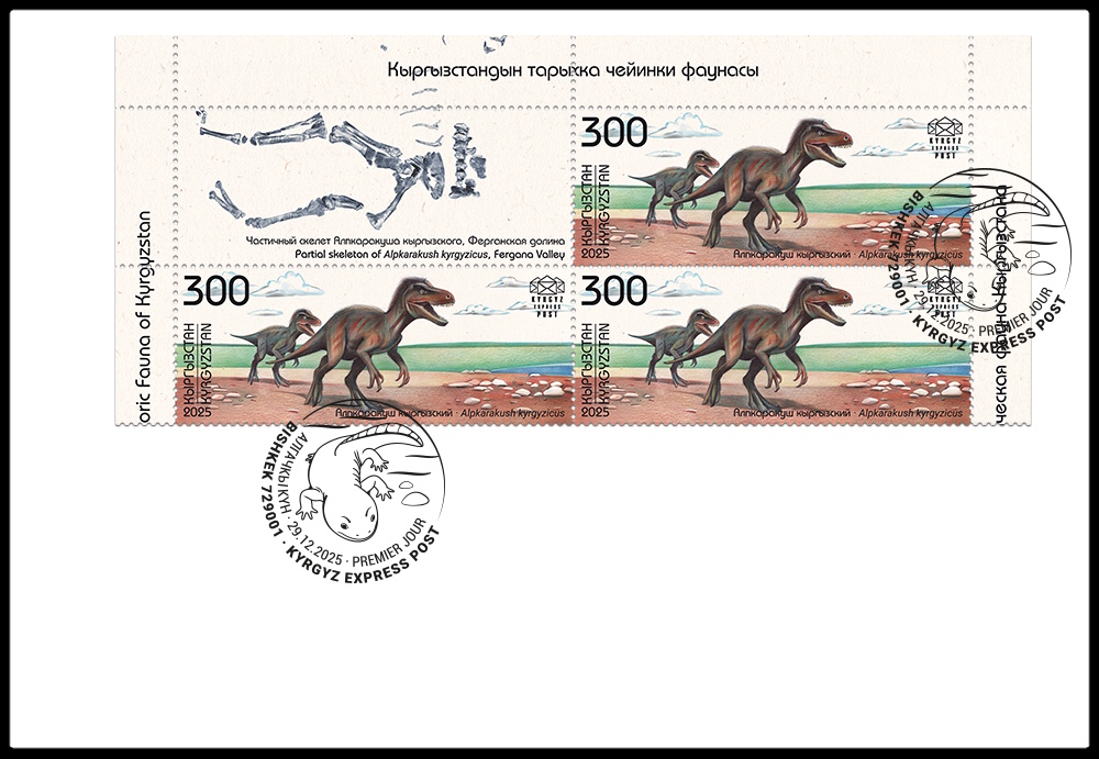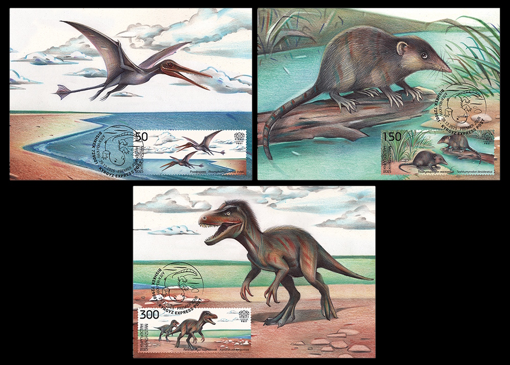 All four prehistoric animals featured on the stamps and the postmark were discovered in the Balabansai Formation is a fossil rich-unit.