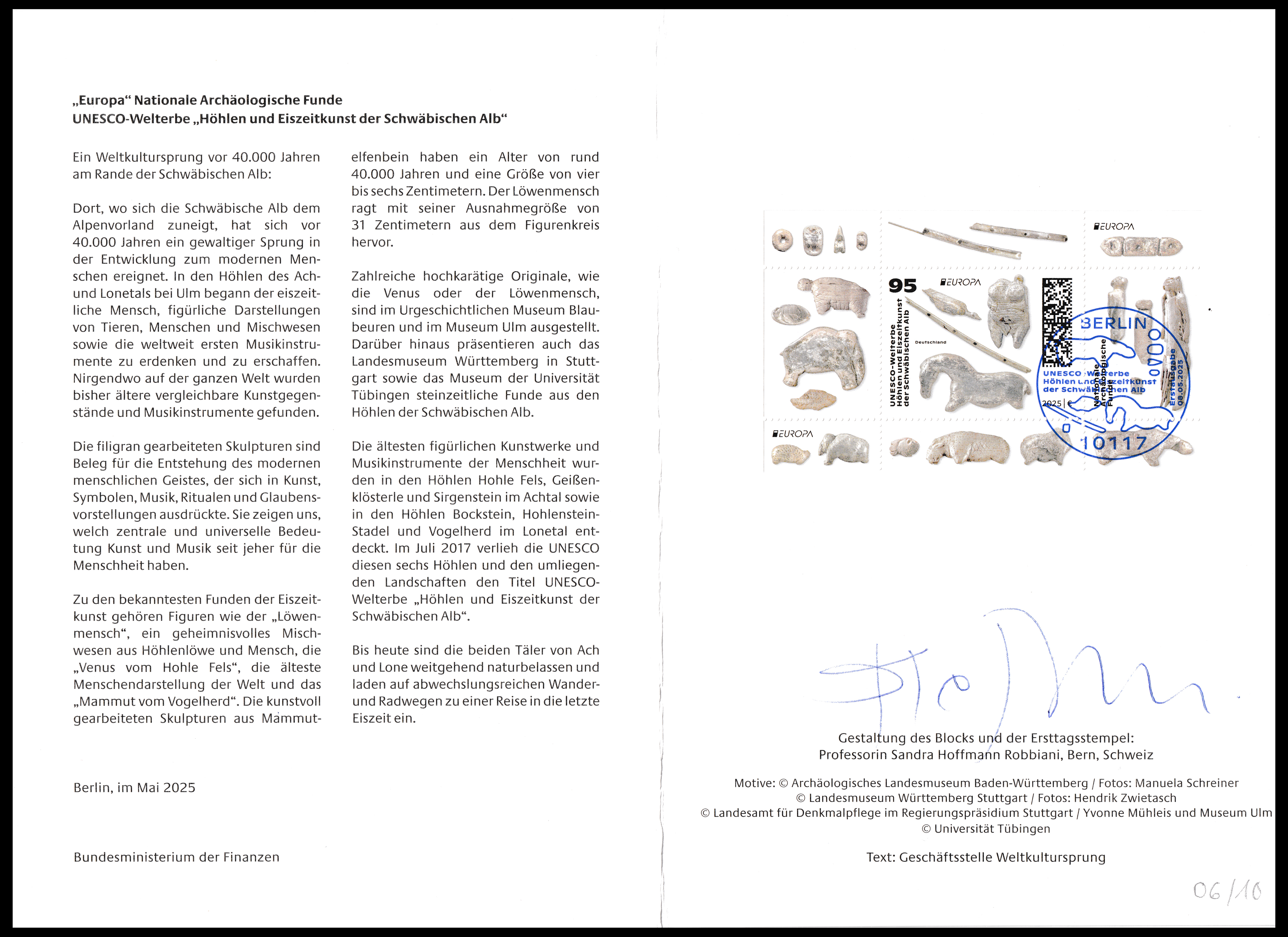 | Souvenir Card of German Federal Ministry of Finance, signed by the stamp designer Sandra Hoffmann Robbiani |