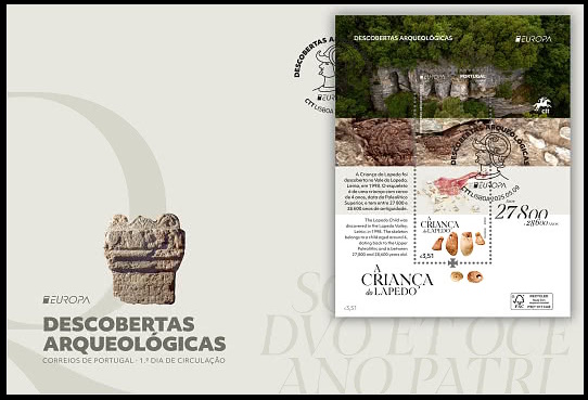 The souvenir sheet from the mainland issue depicts the skeleton, artifacts, and excavation site of the "Lapedo Child."