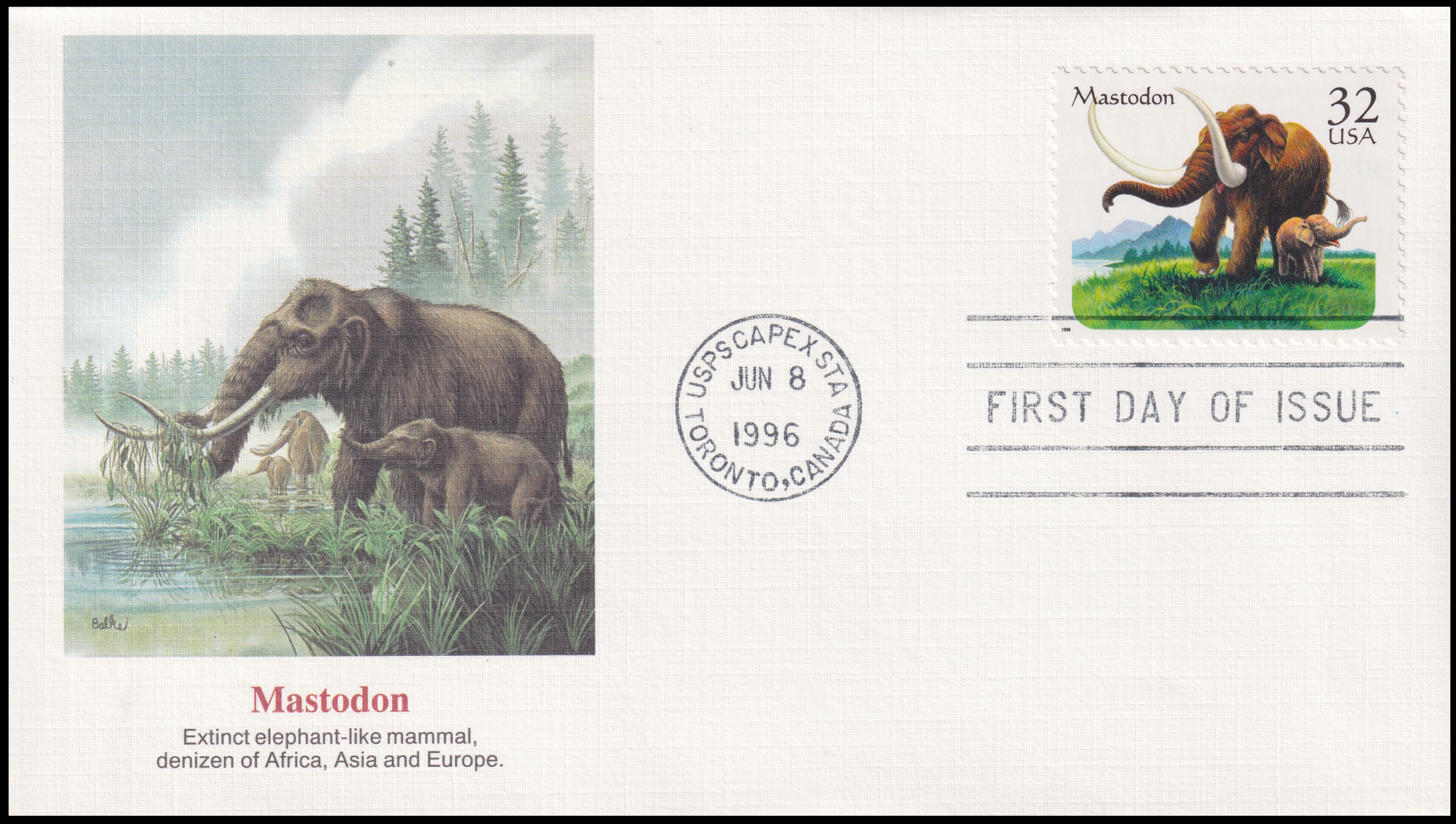 The mastodon bones and reconstructed skeleton on the stamp belonged to the first mounted mastodon in the United States.