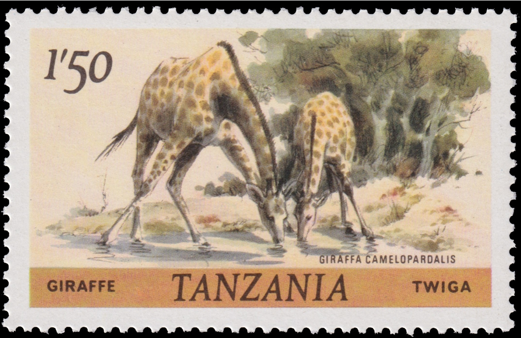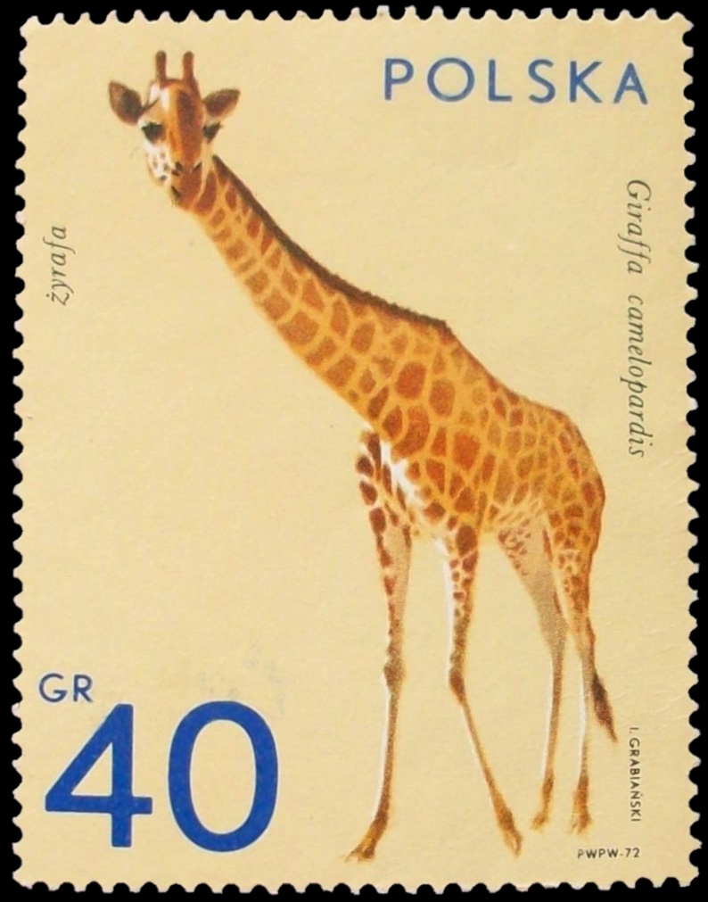 Modern giraffe (long neck): Giraffa camelopardalis on stamps of