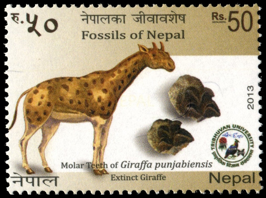 Prehistoric giraffids (short neck): Giraffa punjabiensis and Giraffokeryx punjabiensis on postage stamps of Nepal 2013 and 2017 respectively, MiNr.: 1123, 1252; Scott: 940, 1049. |