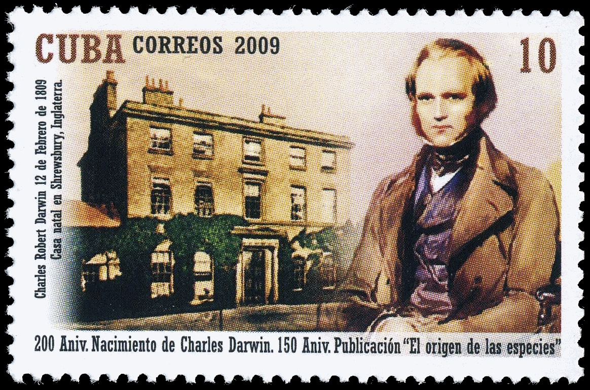 Charles Darwin in the age of 31, next to the Mount (his parents’ house) in Shrewsbury on stamp of Cuba 2009,