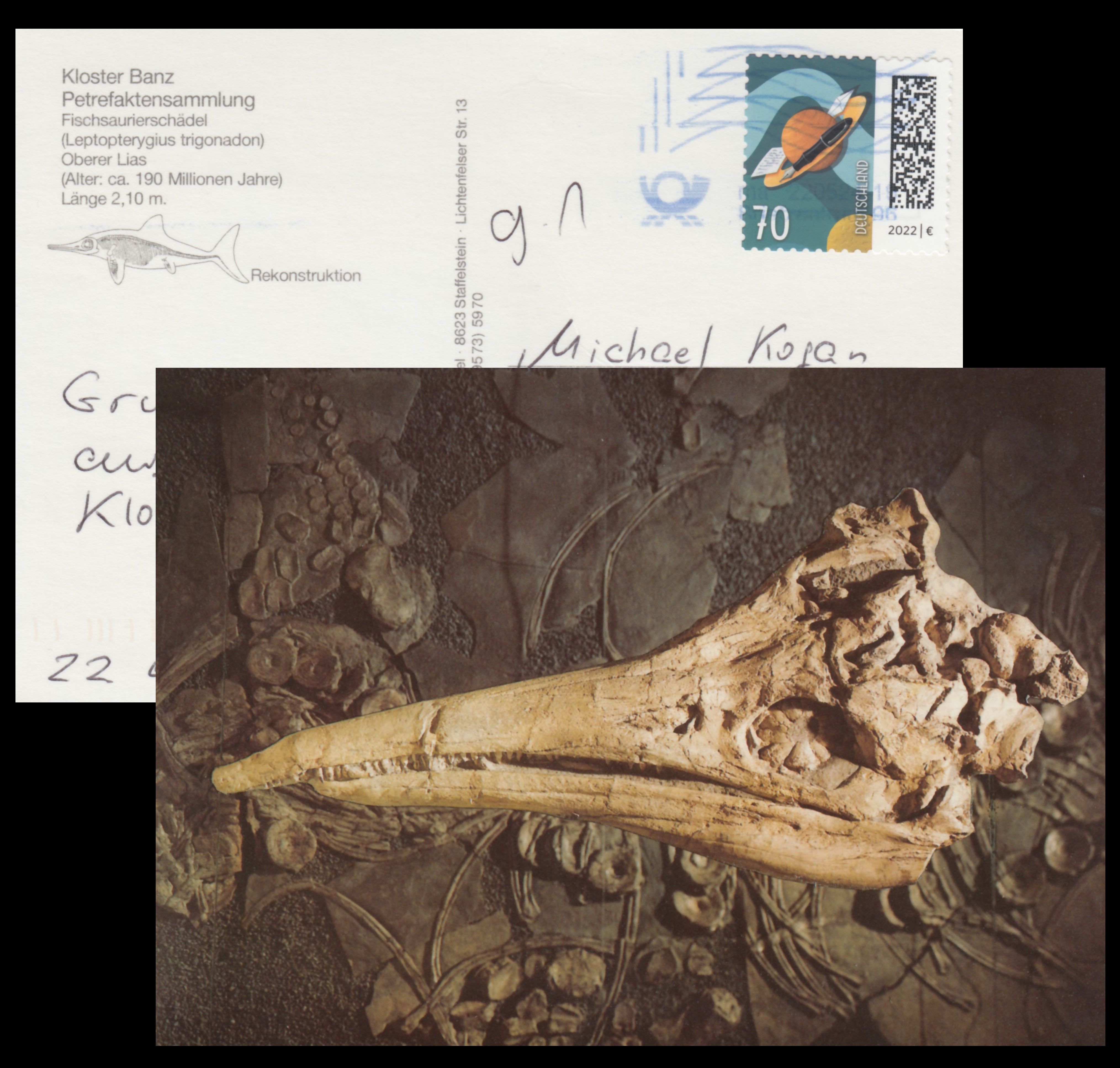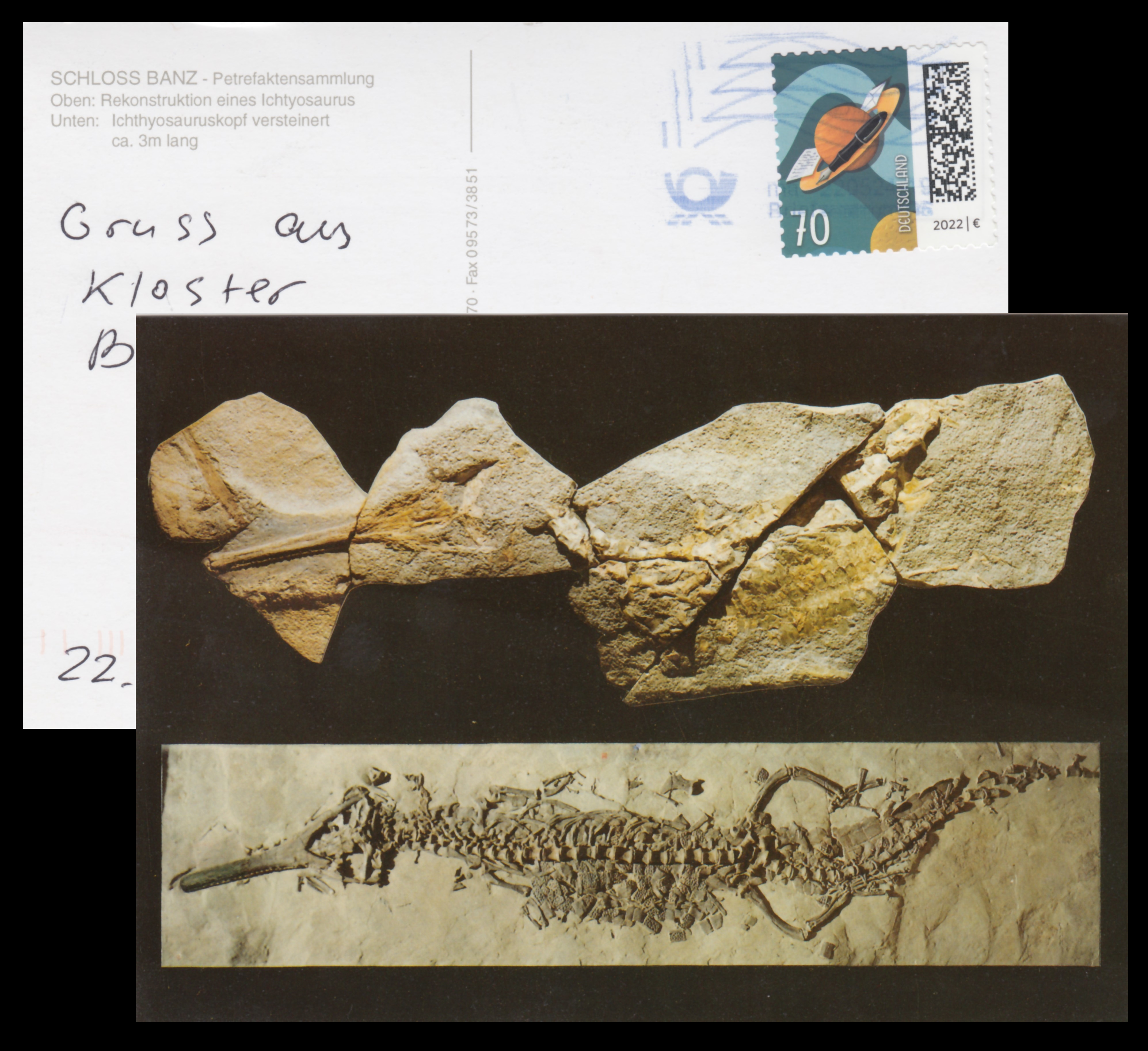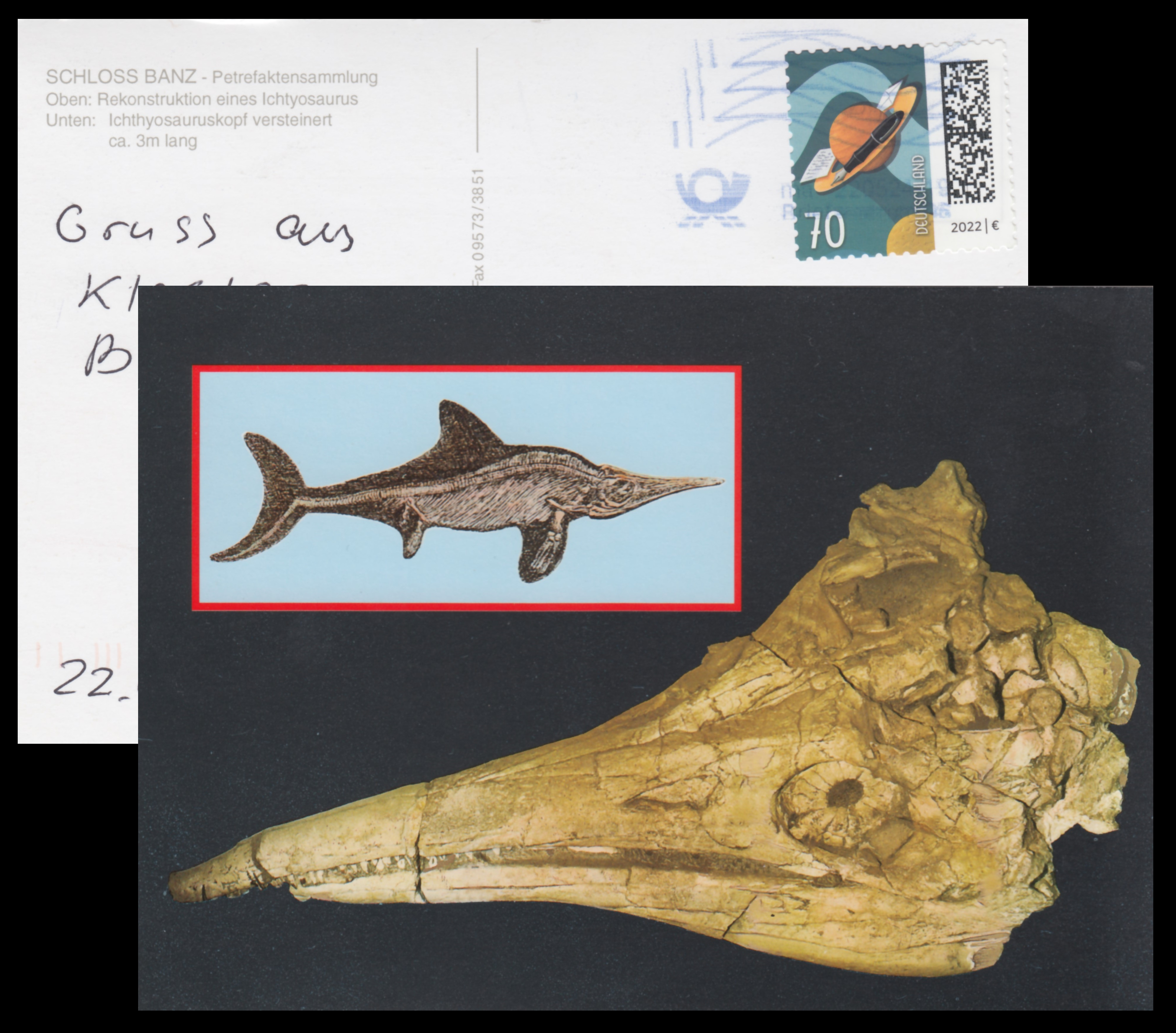 Gruss aus Schloss Banzin German) of Kingdom of Bavaria (today part of Germany) are the oldest philatelic items depicting ichthyosaurs known to the author to date. The oldest item in the author’s collection was posted in 1897, but it is likely that even earlier versions may exist.