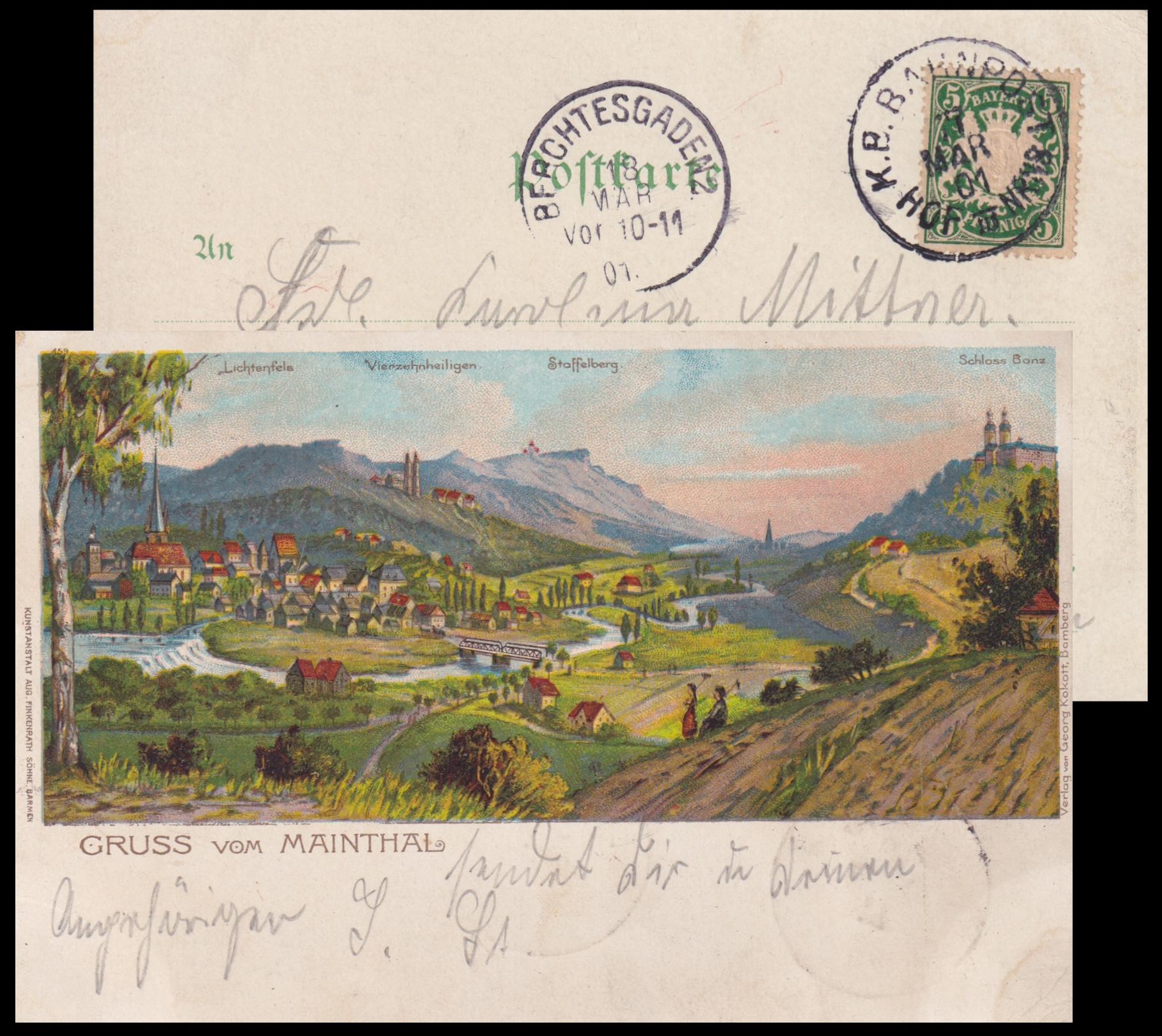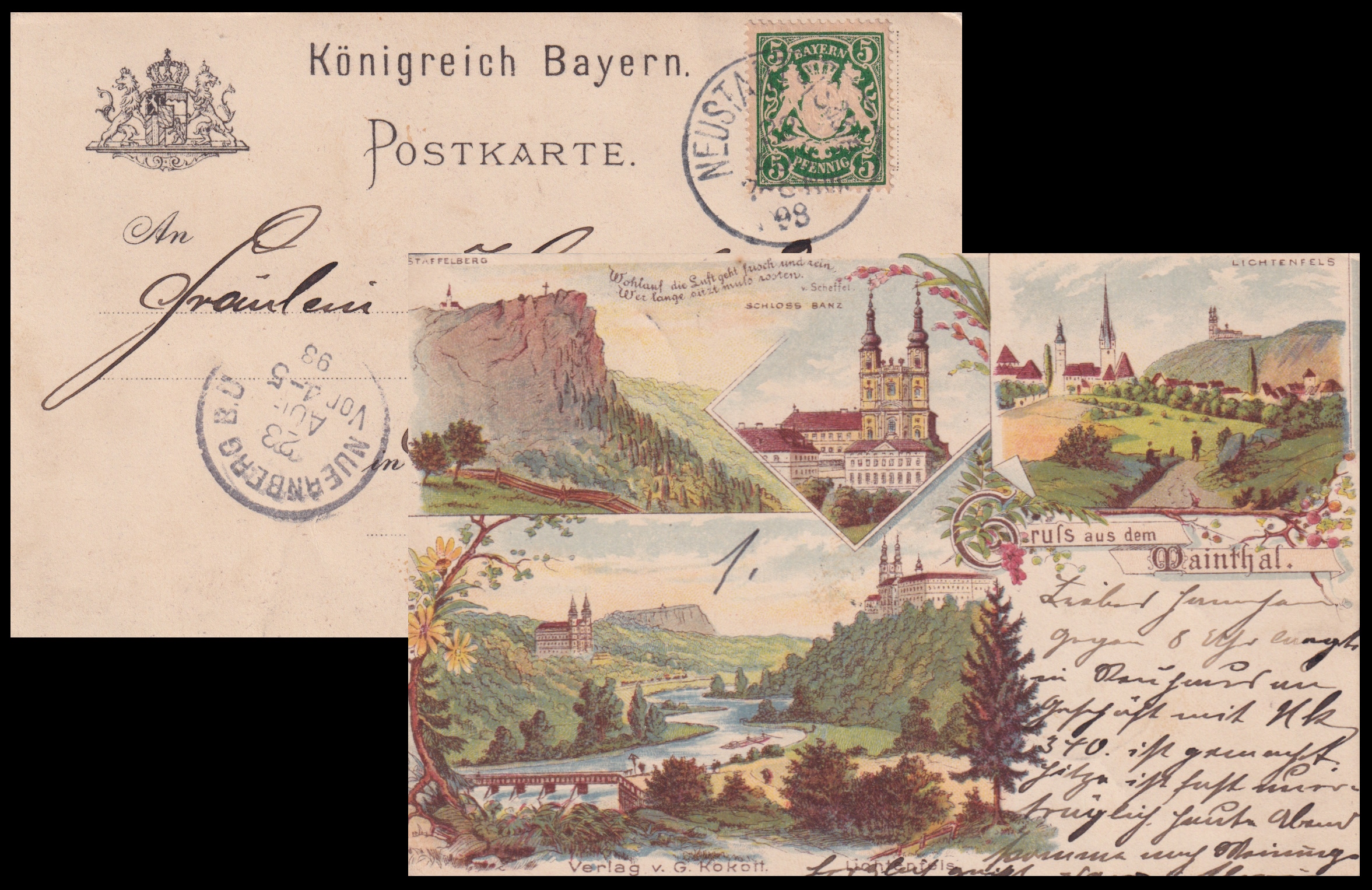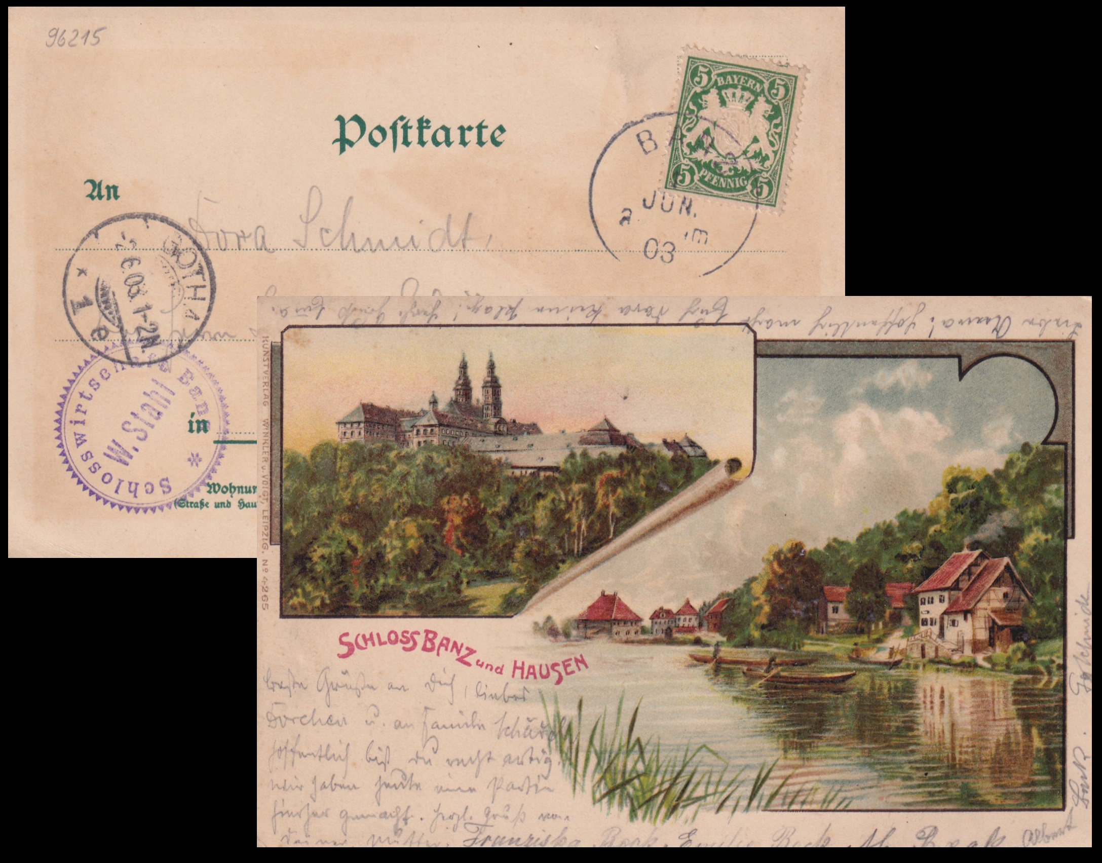 | Castle Banz on vintage postcards of Kingdom of Bavaria (today part of Germany), posted from Banz in 1898 and 1903 respectively. | |