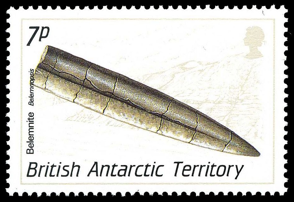 | Ammonites on commemorative postmark of Germany 1999 | Belemnite fossil on definitive stamp of the British Antarctic Territory 1990 | Fossilized sea lily (upper right) on label attached to stamp in honour of Joachim Barrande, Czech Republic, 1999. Other fossils on the label include a trilobite, a nautiloid, and a graptolite. |