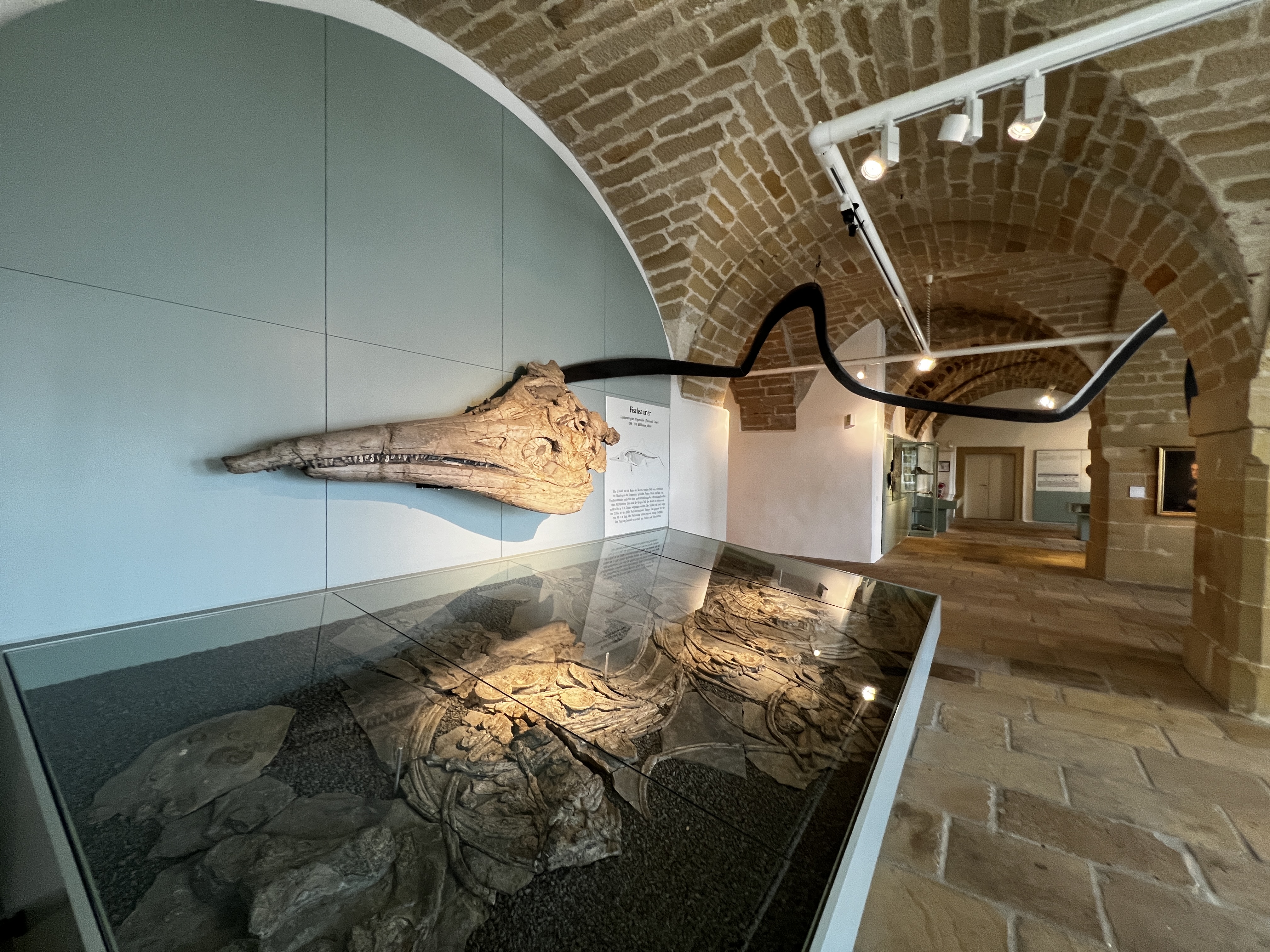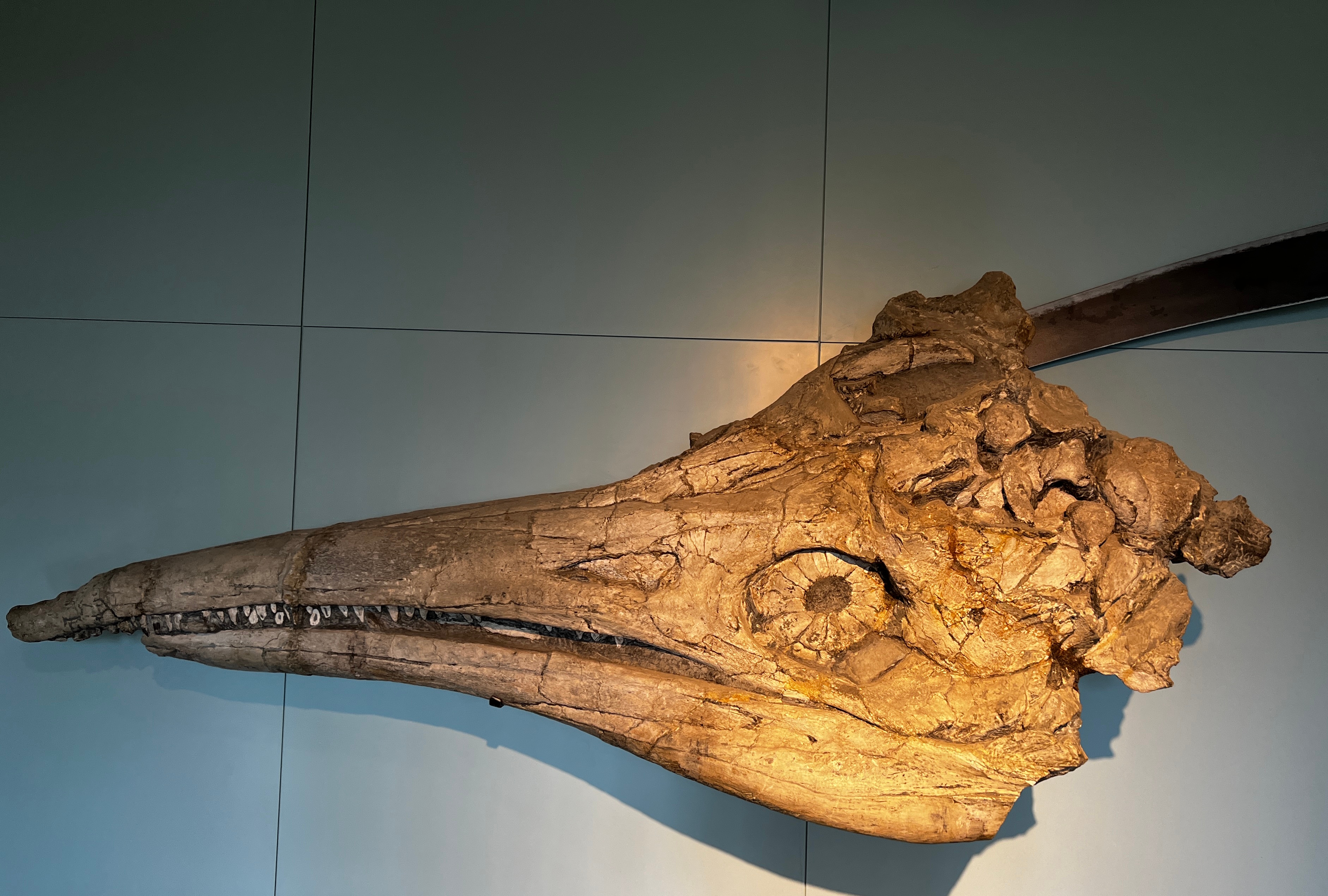 freed from the sediments that enclosed it and is displayed, supported by strong iron brackets, in the largest hall of the collection.