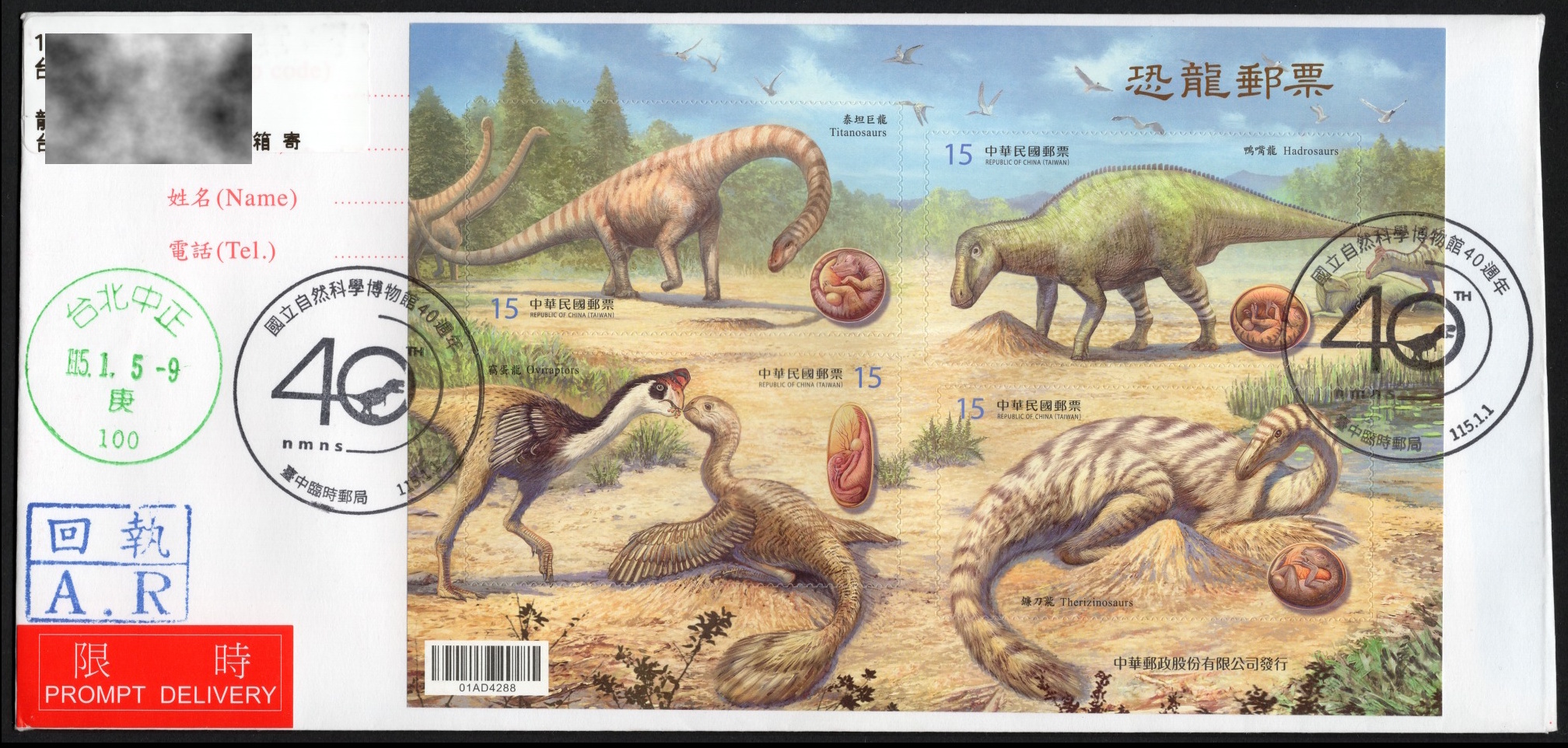 Official stamps of Taiwan related to Paleontology: dinosaurs and their eggs