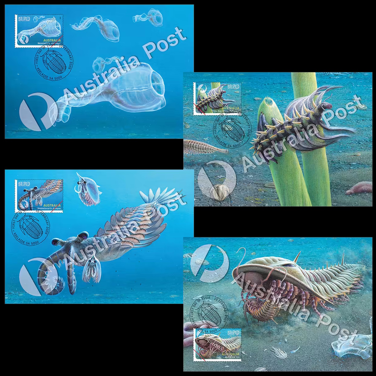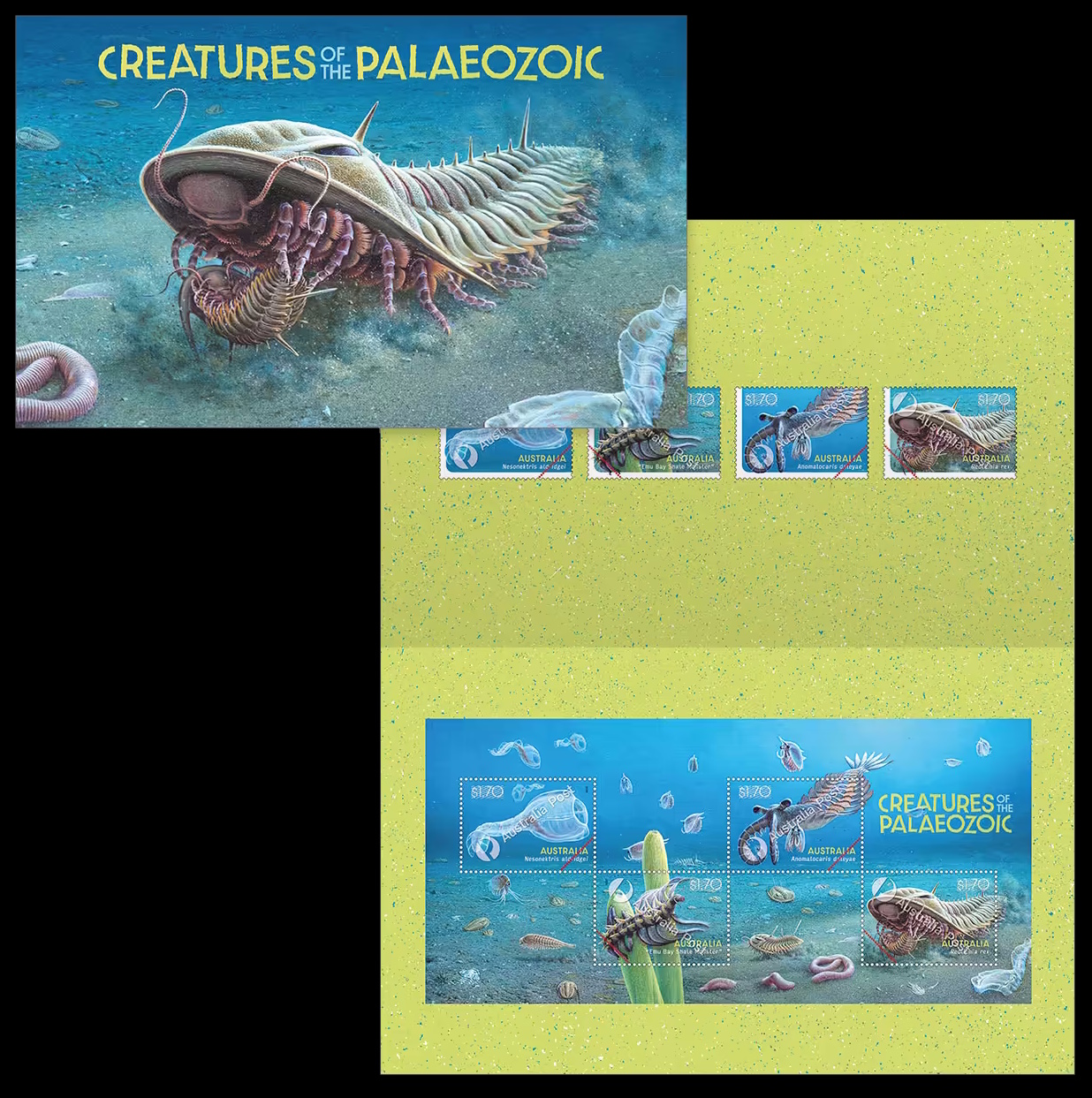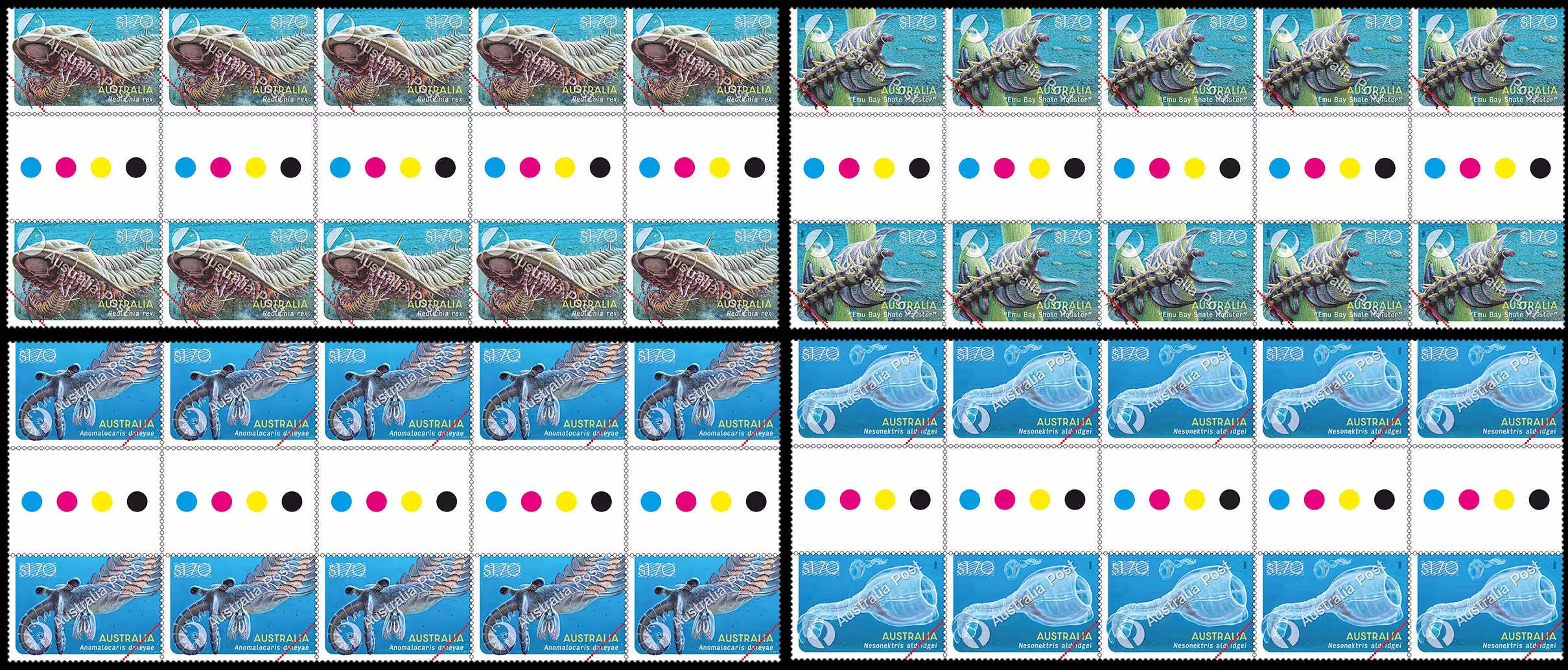 AUD 1.70 - Nesonektris Aldridgei AUD 1.70 - Emu Bay Shale Monster AUD 1.70 - Anomalocaris Daleyae AUD 1.70 - Redlichia Rex Many other sea creaturess featured on the margins of the Mini-Sheets |