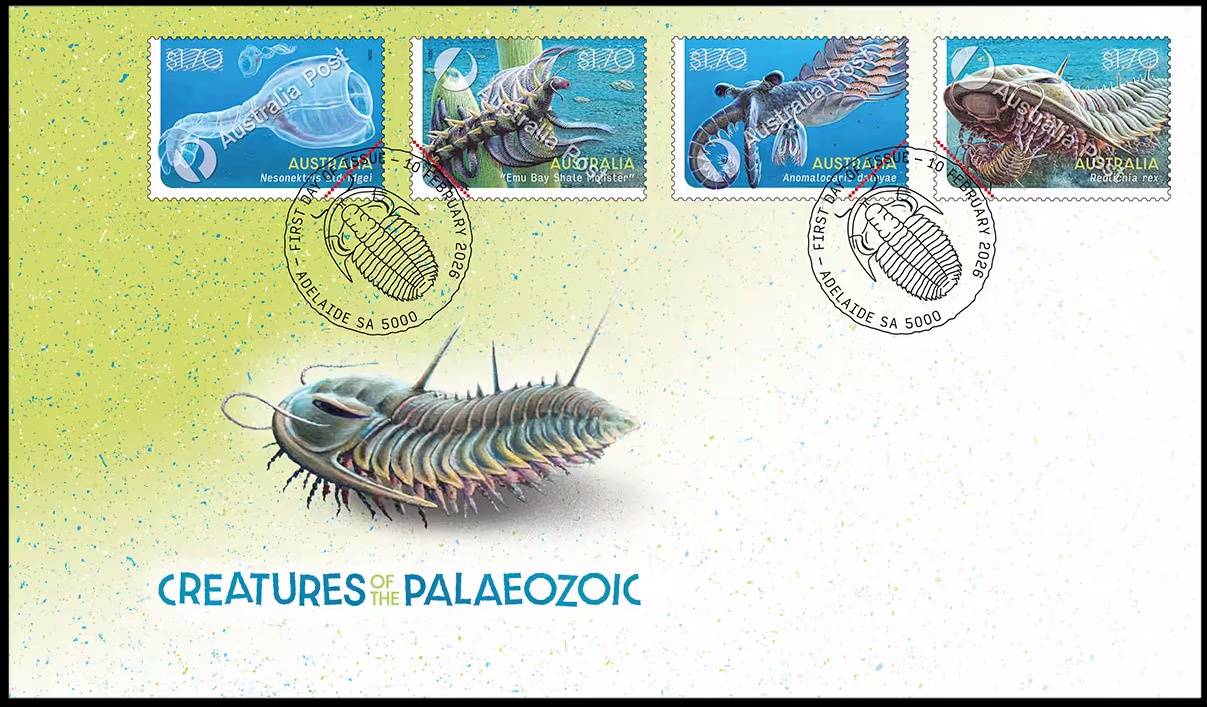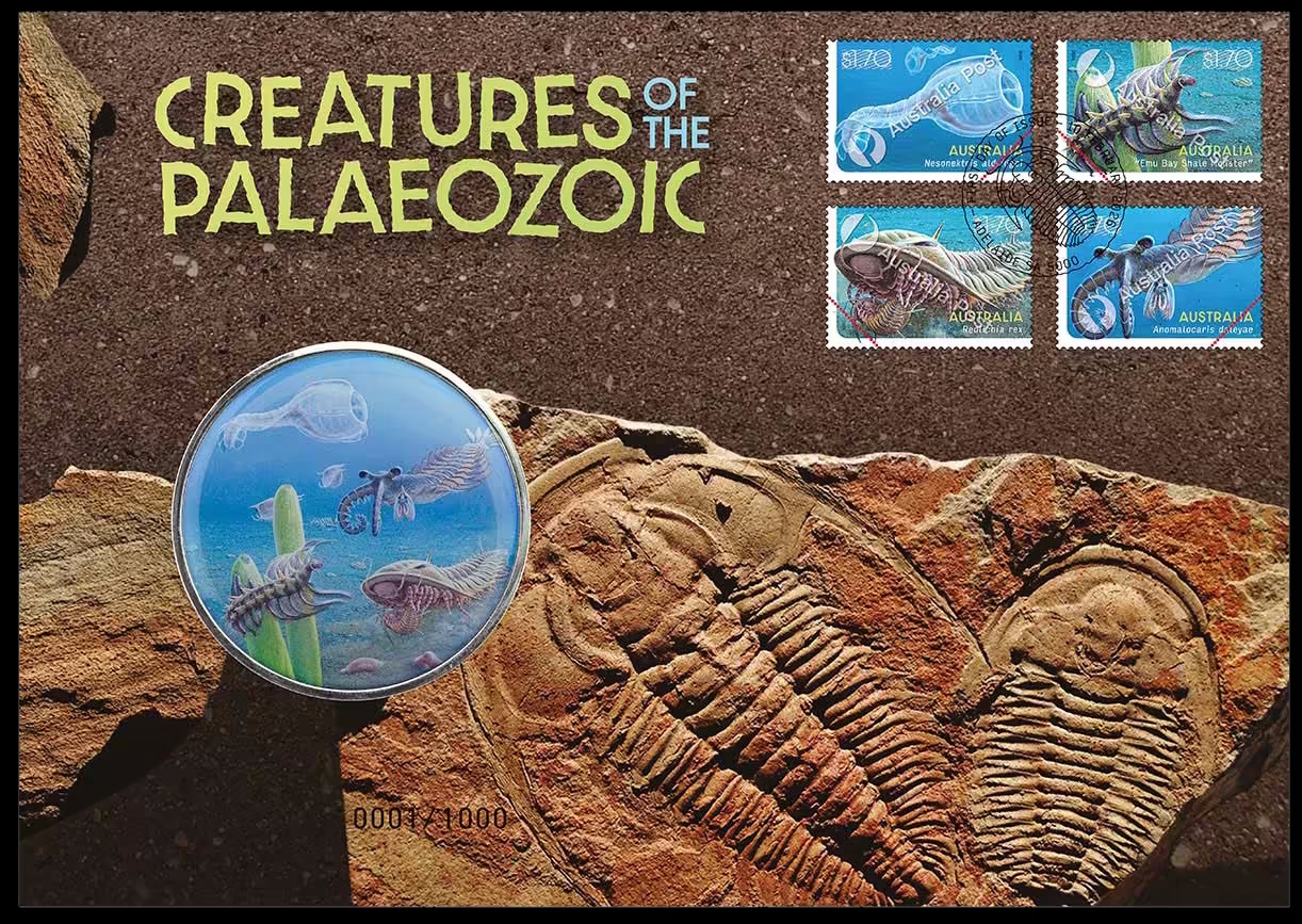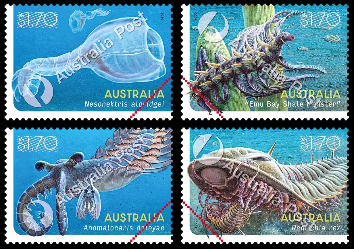AUD 1.70 - Nesonektris Aldridgei AUD 1.70 - Emu Bay Shale Monster AUD 1.70 - Anomalocaris Daleyae AUD 1.70 - Redlichia Rex Many other sea creaturess featured on the margins of the Mini-Sheets |