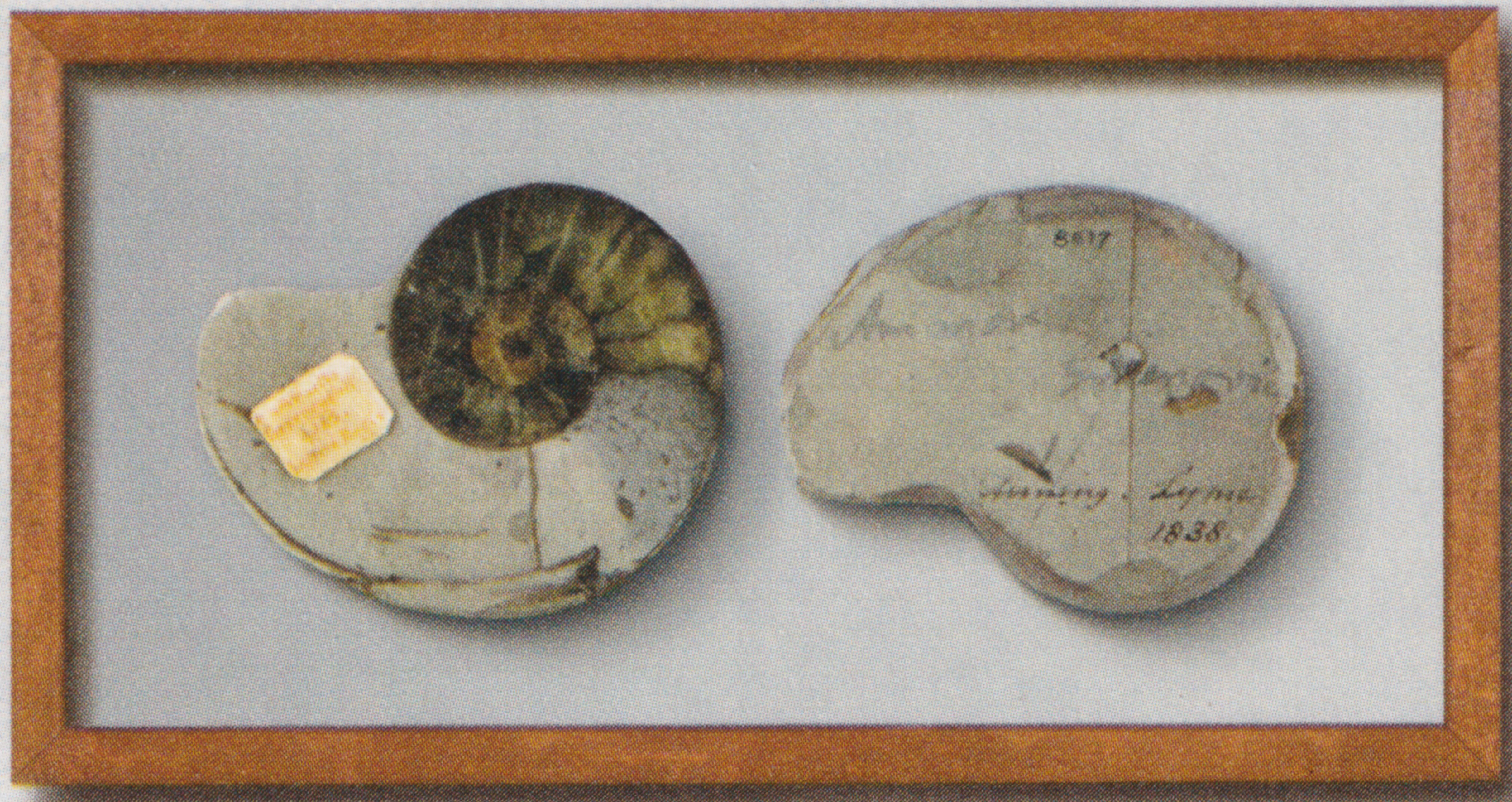 Ammonite and Mosasaur of Lyme Regis and dinosaur footprints from Edinburgh.