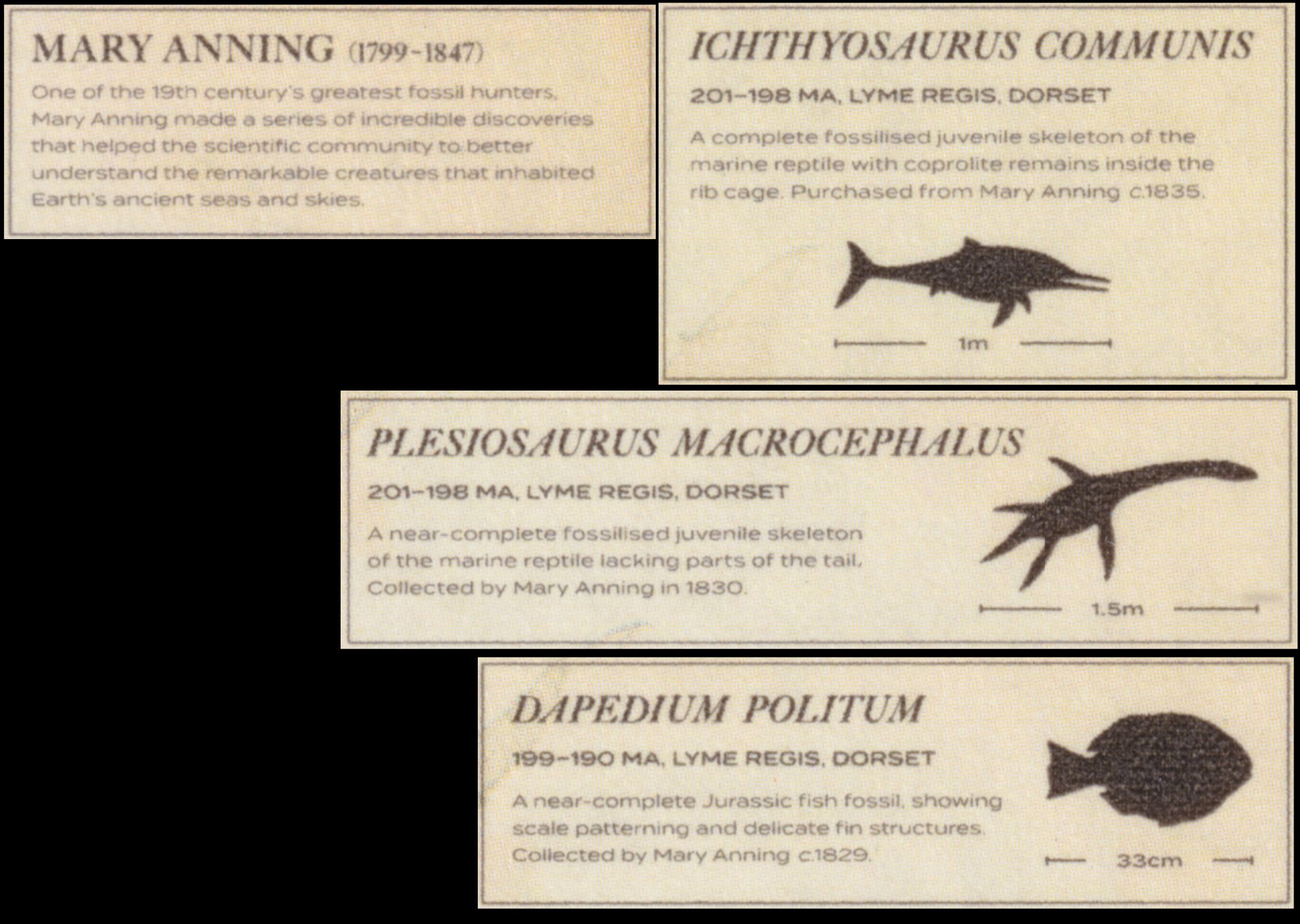 The portrait of Mary Anning and each of her discoveries are presented within picture