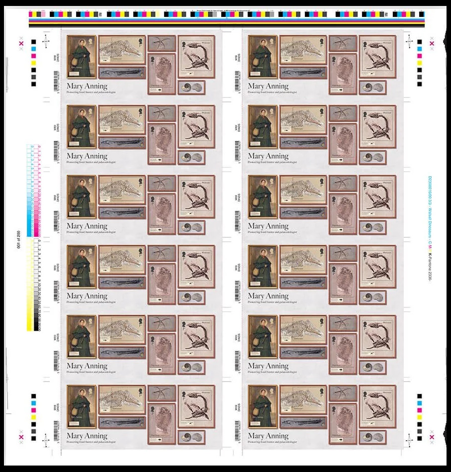 A limited-edition Press Sheet featuring 12 Mary Anning Miniature Sheets.