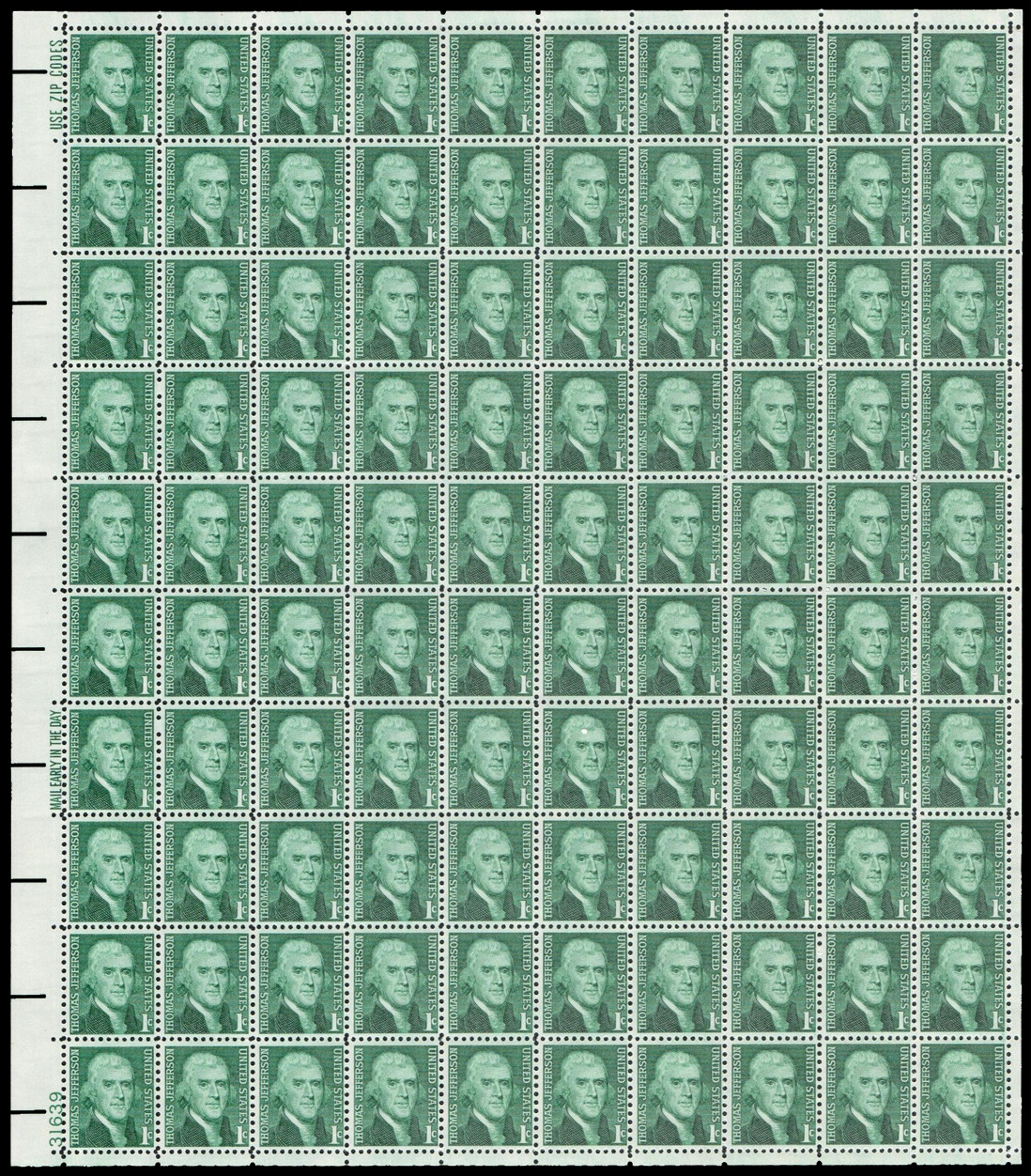This stamp, designed by Robert J. Jones of New York City, was based on the portrait of Thomas Jefferson